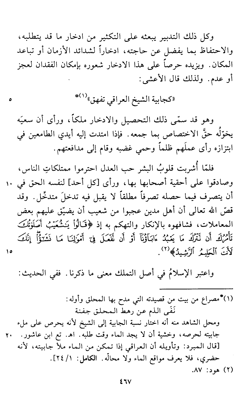 فلمّا أُشربت قلوبُ البشر حب العدل احترموا ممتلكاتِ الناس، وصادقوا على أحقية أصحابها بها، ورأى [كل أحد] لنفسه الحق في أن يتصرف فيما حصله تصرفاً مطلقاً لا يقبل فيه تدخلَ متدخَّل. وقد قصّ الله تعالى أن أهل مدين عجبوا من شعيب أن يضيّق عليهم بعض المعاملات، فشافهوه بالإنكار والتهكم به إذ {قَالُوا يَاشُعَيْبُ أَصَلَاتُكَ تَأْمُرُكَ أَنْ نَتْرُكَ مَا يَعْبُدُ آبَاؤُنَا أَوْ أَنْ نَفْعَلَ فِي أَمْوَالِنَا مَا نَشَاءُ إِنَّكَ لَأَنْتَ الْحَلِيمُ الرَّشِيدُ} (¬2).