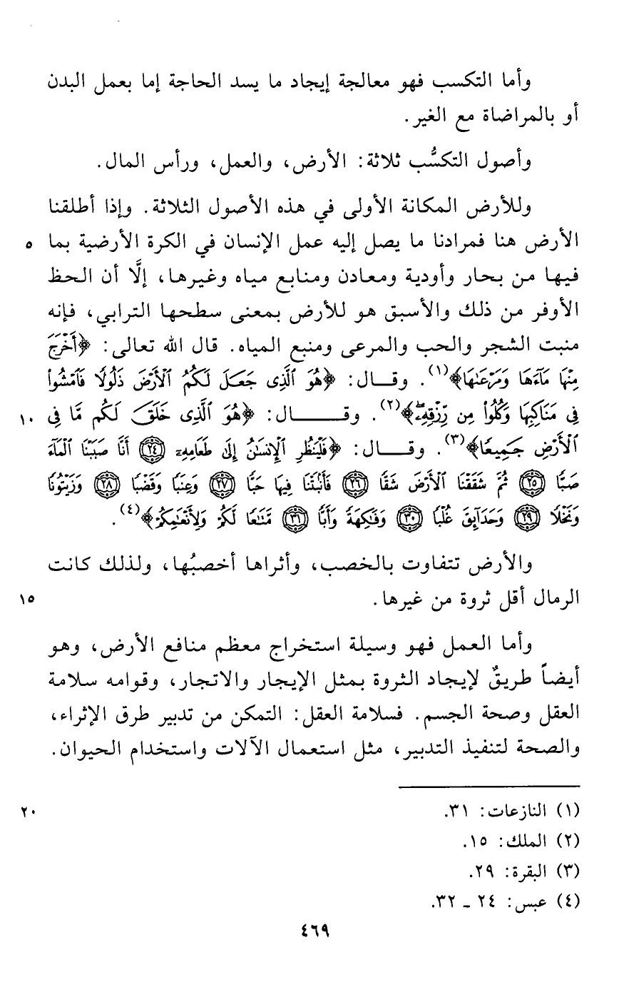 وللأرض المكانة الأولى في هذه الأصول الثلاثة. وإذا أطلقنا الأرض هنا فمرادنا ما يصل إليه عمل الإنسان في الكرة الأرضية بما فيها من بحار وأودية ومعادن ومنابع مياه وغيرها، إلَّا أن الحظ الأوفر من ذلك والأسبق هو للأرض بمعنى سطحها الترابي، فإنه منبت الشجر والحب والمرعى ومنبع المياه. قال الله تعالى: {أَخْرَجَ مِنْهَا مَاءَهَا وَمَرْعَاهَا} (¬1). وقال: {هُوَ الَّذِي جَعَلَ لَكُمُ الْأَرْضَ ذَلُولًا فَامْشُوا فِي مَنَاكِبِهَا وَكُلُوا مِنْ رِزْقِهِ} (¬2). وقال: {هُوَ الَّذِي خَلَقَ لَكُمْ مَا فِي الْأَرْضِ جَمِيعًا} (¬3). وقال: {فَلْيَنْظُرِ الْإِنْسَانُ إِلَى طَعَامِهِ (24) أَنَّا صَبَبْنَا الْمَاءَ صَبًّا (25) ثُمَّ شَقَقْنَا الْأَرْضَ شَقًّا (26) فَأَنْبَتْنَا فِيهَا حَبًّا (27) وَعِنَبًا وَقَضْبًا (28) وَزَيْتُونًا وَنَخْلًا (29) وَحَدَائِقَ غُلْبًا (30) وَفَاكِهَةً وَأَبًّا (31) مَتَاعًا لَكُمْ وَلِأَنْعَامِكُمْ} (¬4).