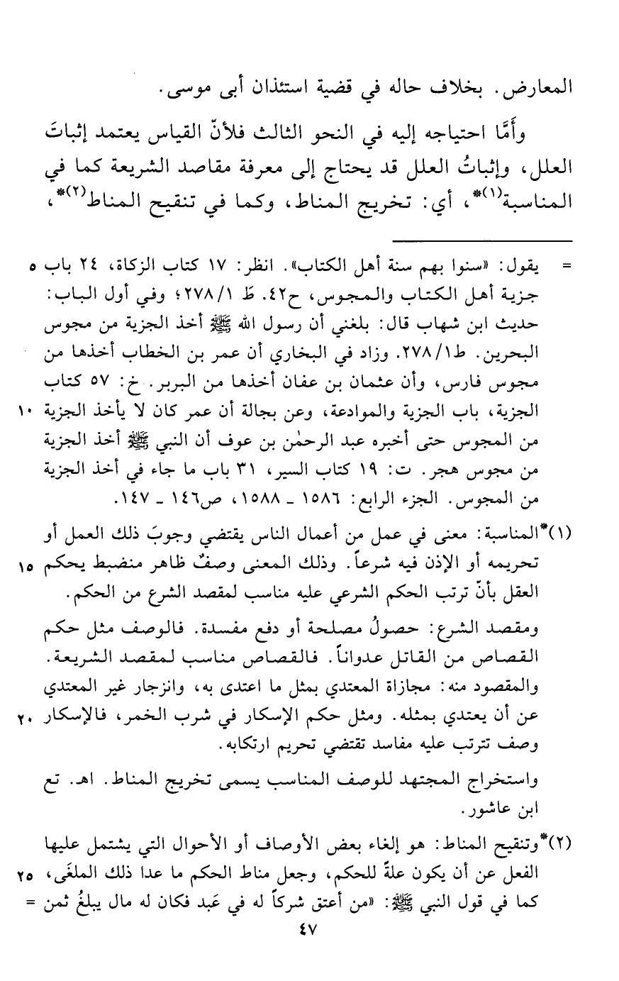 (¬1) المناسبة: معنى في عمل من أعمال الناس يقتضي وجوبَ ذلك العمل أو تحريمه أو الإذن فيه شرعاً. وذلك المعنى وصفٌ ظاهر منضبط يحكم العقل بأنّ ترتب الحكم الشرعي عليه مناسب لمقصد الشرع من الحكم.