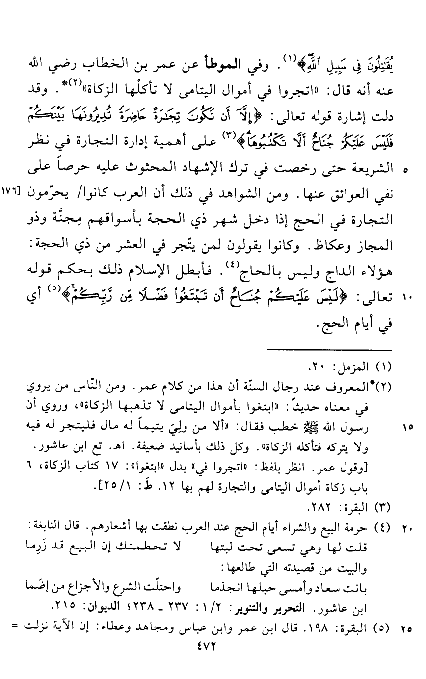 يُقَاتِلُونَ فِي سَبِيلِ اللَّهِ} (¬1). وفي الموطأ عن عمر بن الخطاب رضي الله عنه أنه قال: "اتجروا في أموال اليتامى لا تأكلْها الزكاة" (¬2) *. وقد دلت إشارة قوله تعالى: {إِلَّا أَنْ تَكُونَ تِجَارَةً حَاضِرَةً تُدِيرُونَهَا بَيْنَكُمْ فَلَيْسَ عَلَيْكُمْ جُنَاحٌ أَلَّا تَكْتُبُوهَا} (¬3) على أهمية إدارة التجارة في نظر الشريعة حتى رخصت في ترك الإشهاد المحثوث عليه حرصاً على نفي العوائق عنها. ومن الشواهد في ذلك أن العرب كانوا يحرّمون التجارة في الحج إذا دخل شهر ذي الحجة بأسواقهم مِجنَّة وذو المجاز وعكاظ. وكانوا يقولون لمن يتّجر في العشر من ذي الحجة: هؤلاء الداج وليس بالحاج (¬4). فأبطل الإِسلام ذلك بحكم قوله تعالى: {لَيْسَ عَلَيْكُمْ جُنَاحٌ أَنْ تَبْتَغُوا فَضْلًا مِنْ رَبِّكُمْ} (¬5) أي في أيام الحج.