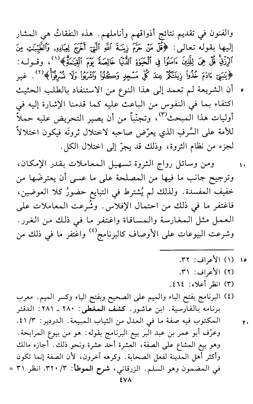 والفنون في تقديم نتائج أذواقهم وأناملهم. هذه النفقاتُ هي المشار إليها بقوله تعالى: {قُلْ مَنْ حَرَّمَ زِينَةَ اللَّهِ الَّتِي أَخْرَجَ لِعِبَادِهِ وَالطَّيِّبَاتِ مِنَ الرِّزْقِ قُلْ هِيَ لِلَّذِينَ آمَنُوا فِي الْحَيَاةِ الدُّنْيَا خَالِصَةً يَوْمَ الْقِيَامَةِ} (¬1)، وقوله: {يَابَنِي آدَمَ خُذُوا زِينَتَكُمْ عِنْدَ كُلِّ مَسْجِدٍ وَكُلُوا وَاشْرَبُوا وَلَا تُسْرِفُوا} (¬2). غير أن الشريعة لم تعمد إلى هذا النوع من الاستنفاد بالطلب الحثيث اكتفاء بما في النفوس من الباعث عليه كما قدمنا الإشارة إليه في أوليات هذا المبحث (¬3)، وتجنّباً من أن يصير التحريض عليه حملاً للأمة على السَّرفِ الذي يعرّض صاحبه لاختلال ثروتَه فيكون اختلالاً لجزء من نظام الثروة، وذلك قد يجرّ إلى اختلال الكل.
