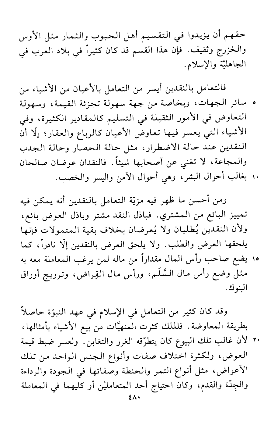 فالتعامل بالنقدين أيسر من التعامل بالأعيان من الأشياء من سائر الجهات، وبخاصة من جهة سهولة تجزئة القيمة، وسهولة التعاوض في الأمور الثقيلة في التسليم كالمقادير الكثيرة، وفي الأشياء التي يعسر فيها تعاوض الأعيان كالرباع والعقار؛ إلّا أن النقدين عند حالة الاضطرار، مثل حالة الحصار وحالة الجدب والمجاعة، لا تغني عن أصحابها شيئاً. فالنقدان عوضان صالحان بغالب أحوال البشر، وهي أحوال الأمن واليسر والخصب.