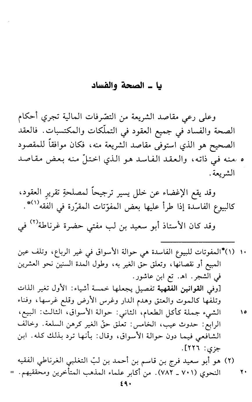 وعلى رعي مقاصد الشريعة من التصرفات المالية تجري أحكام الصحة والفساد في جميع العقود في التملّكات والمكتسبات. فالعقد الصحيح هو الذي استوفى مقاصد الشريعة منه، فكان موافقاً للمقصود منه في ذاته، والعقد الفاسد هو الذي اختلّ منه بعض مقاصد الشريعة.