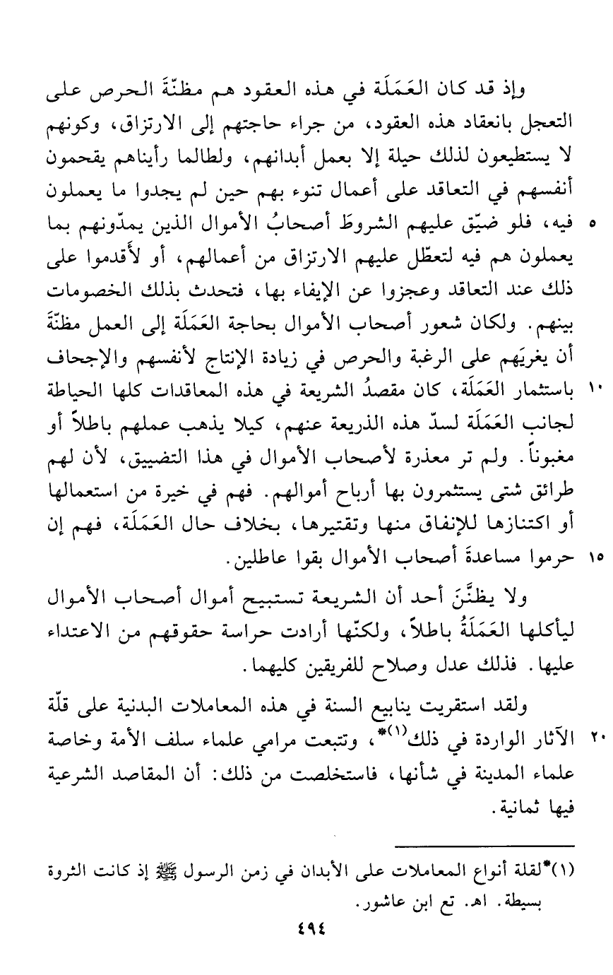 وإذ قد كان العَمَلَة في هذه العقود هم مظنّةَ الحرص على التعجل بانعقاد هذه العقود، من جراء حاجتهم إلى الارتزاق، وكونهم لا يستطيعون لذلك حيلة إلا بعمل أبدانهم، ولطالما رأيناهم يقحمون أنفسهم في التعاقد على أعمال تنوء بهم حين لم يجدوا ما يعملون فيه، فلو ضيّق عليهم الشروطَ أصحابُ الأموال الذين يمدّونهم بما يعملون هم فيه لتعطّل عليهم الارتزاق من أعمالهم، أو لأَقدموا على ذلك عند التعاقد وعجزوا عن الإيفاء بها، فتحدث بذلك الخصومات بينهم. ولكان شعور أصحاب الأموال بحاجة العَمَلَة إلى العمل مظنّةَ أن يغريَهم على الرغبة والحرص في زيادة الإنتاج لأنفسهم والإجحاف باستثمار العَمَلَة، كان مقصدُ الشريعة في هذه المعاقدات كلها الحياطة لجانب العَمَلَة لسدّ هذه الذريعة عنهم، كيلا يذهب عملهم باطلاً أو مغبوناً. ولم تر معذرة لأصحاب الأموال في هذا التضييق, لأن لهم طرائق شتى يستثمرون بها أرباح أموالهم. فهم في خيرة من استعمالها أو اكتنازها للإنفاق منها وتقتيرها، بخلاف حال العَمَلَة، فهم إن حرموا مساعدةَ أصحاب الأموال بقوا عاطلين.