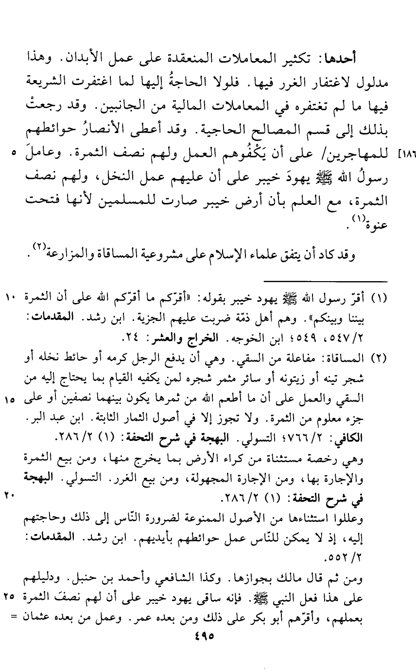 (¬1) أقرّ رسول الله - صلى الله عليه وسلم - يهود خيبر بقوله: "أقرّكم ما أقرّكم الله على أن الثمرة بيننا وبينكم". وهم أهل ذمّة ضربت عليهم الجزية. ابن رشد. المقدمات: 2/ 547، 549؛ ابن الخوجه. الخراج والعشر: 24.