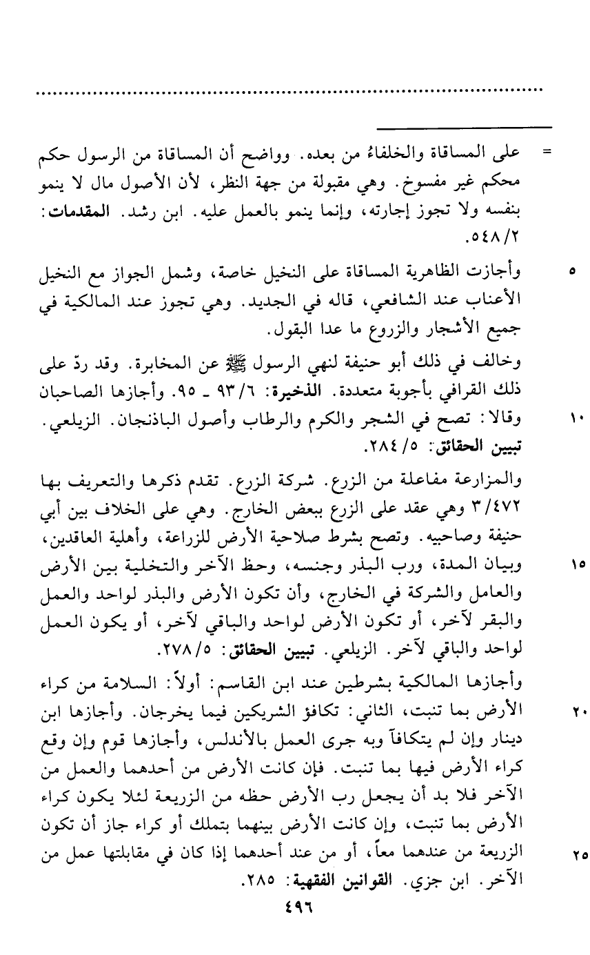 = على المساقاة والخلفاءُ من بعده. وواضح أن المساقاة من الرسول حكم محكم غير مفسوخ. وهي مقبولة من جهة النظر, لأن الأصول مال لا ينمو بنفسه ولا تجوز إجارته، وإنما ينمو بالعمل عليه. ابن رشد. المقدمات: 2/ 548.