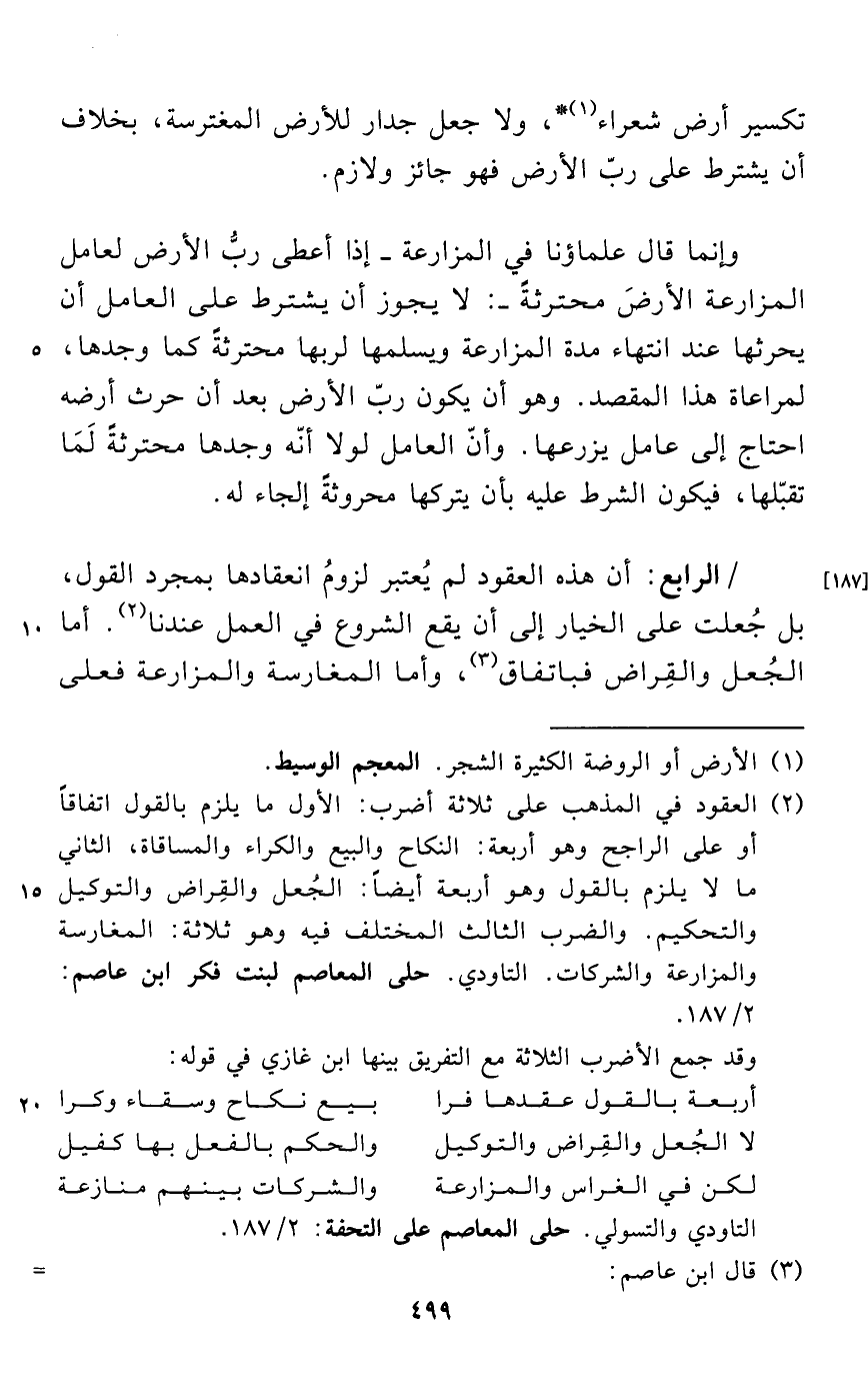 (¬2) العقود في المذهب على ثلاثة أضرب: الأول ما يلزم بالقول اتفاقاً أو على الراجح وهو أربعة: النكاح والبيع والكراء والمساقاة، الثاني ما لا يلزم بالقول وهو أربعة أيضاً: الجُعل والقِراض والتوكيل والتحكيم. والضرب الثالث المختلف فيه وهو ثلاثة: المغارسة والمزارعة والشركات. التاودي. حلى المعاصم لبنت فكر ابن عاصم: 2/ 187.
