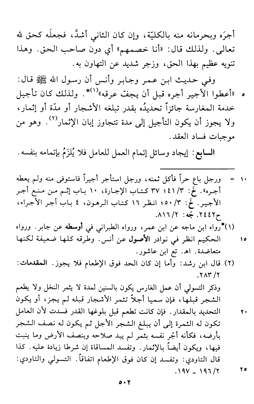 وفي حديث ابن عمر وجابر وأنس أن رسول الله - صلى الله عليه وسلم - قال: "أعطوا الأجير أجره قبل أن يجفّ عرقه" (¬1) *. ولذلك كان تأجيل خدمة المغارسة جائزاً تحديدُه بقدر تبلغه الأشجار أو مدّة أو إثمار، ولا يجوز أن يكون التأجيل إلى مدة تتجاوز إبان الإثمار (¬2). وهو من موجبات فساد العقد.