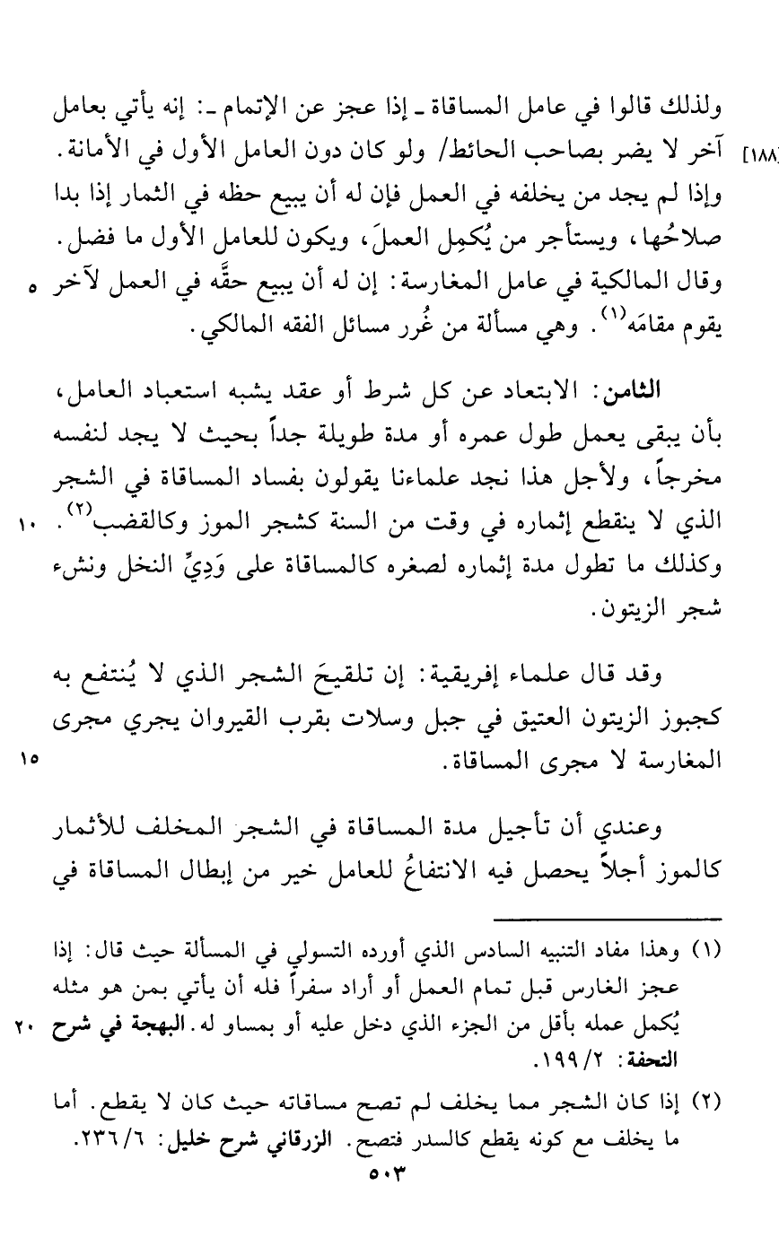 (¬1) وهذا مفاد التنبيه السادس الذي أورده التسولي في المسألة حيث قال: إذا عجز الغارس قبل تمام العمل أو أراد سفراً فله أن يأتي بمن هو مثله يُكمل عمله بأقل من الجزء الذي دخل عليه أو بمساو له. البهجة في شرح التحفة: 2/ 199.