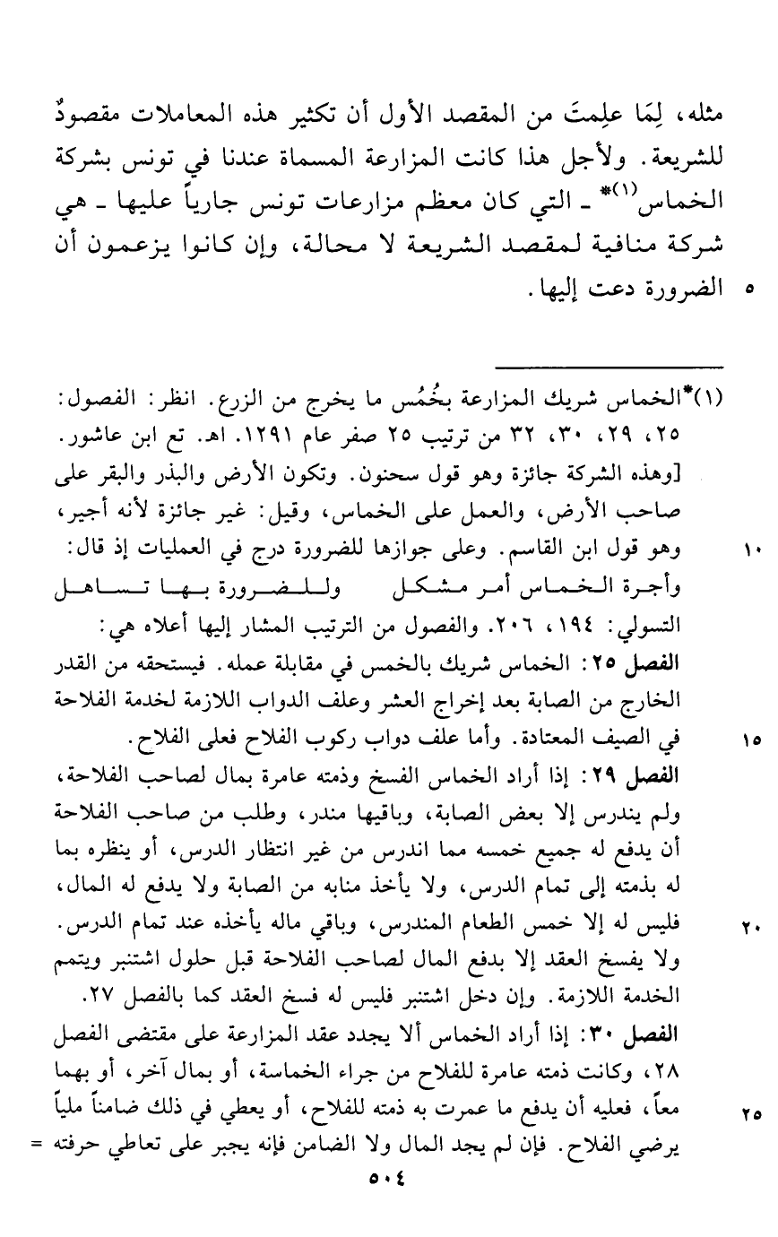 (¬1) * الخماس شريك المزارعة بخُمُس ما يخرج من الزرع. انظر: الفصول: 25، 29، 30، 32 من ترتيب 25 صفر عام 1291. اهـ. تع ابن عاشور. [وهذه الشركة جائزة وهو قول سحنون. وتكون الأرض والبذر والبقر على صاحب الأرض، والعمل على الخماس، وقيل: غير جائزة لأنه أجير، وهو قول ابن القاسم. وعلى جوازها للضرورة درج في العمليات إذ قال: