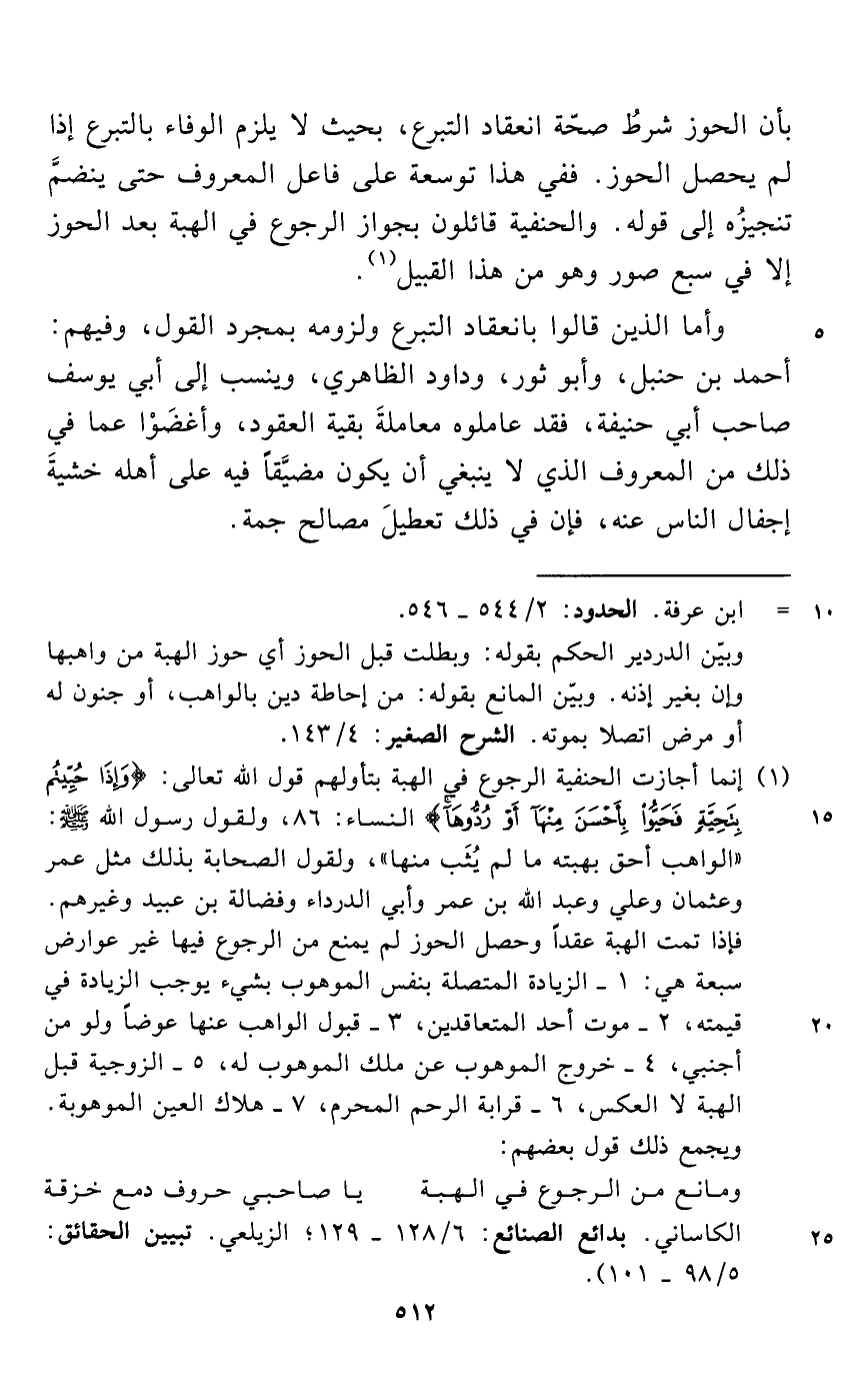 (¬1) إنما أجازت الحنفية الرجوع في الهبة بتأولهم قول الله تعالى: {وَإِذَا حُيِّيتُمْ بِتَحِيَّةٍ فَحَيُّوا بِأَحْسَنَ مِنْهَا أَوْ رُدُّوهَا} النساء: 86، ولقول رسول الله - صلى الله عليه وسلم -: "الواهب أحق بهبته ما لم يُثَب منها"، ويقول الصحابة بذلك مثل عمر وعثمان وعلي وعبد الله بن عمر وأبي الدرداء وفضالة بن عبيد وغيرهم. فإذا تمت الهبة عقداً وحصل الحوز لم يمنع من الرجوع فيها غير عوارض سبعة هي: