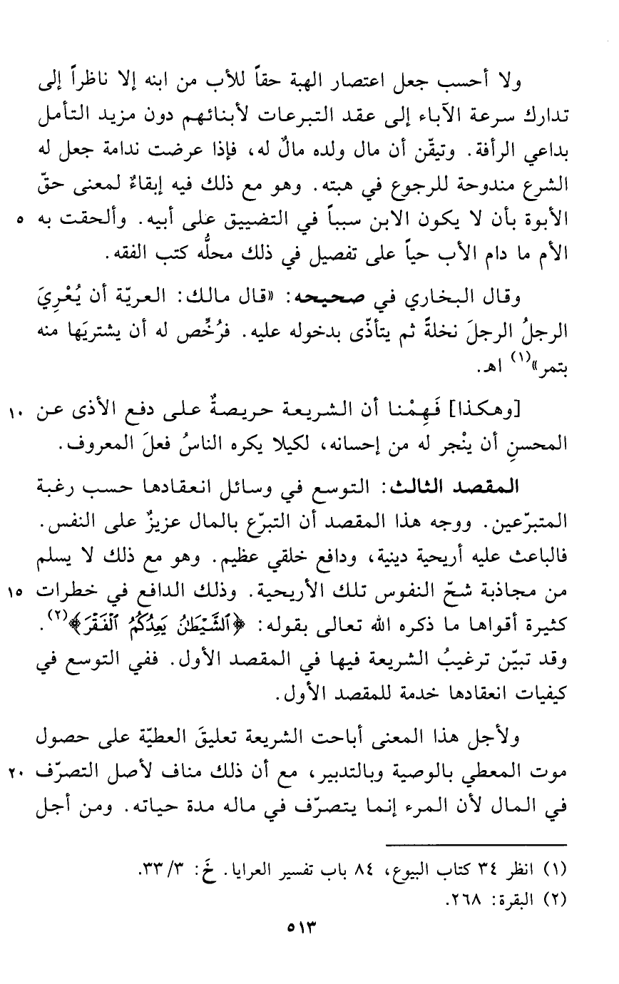 المقصد الثالث: التوسع في وسائل انعقادها حسب رغبة المتبرّعين. ووجه هذا المقصد أن التبرّع بالمال عزيزٌ على النفس. فالباعث عليه أريحية دينية، ودافع خلقي عظيم. وهو مع ذلك لا يسلم من مجاذبة شحّ النفوس تلك الأريحية. وذلك الدافع في خطرات كثيرة أقواها ما ذكره الله تعالى بقوله: {الشَّيْطَانُ يَعِدُكُمُ الْفَقْرَ} (¬2). وقد تبيّن ترغيبُ الشريعة فيها في المقصد الأول. ففي التوسع في كيفيات انعقادها خدمة للمقصد الأول.