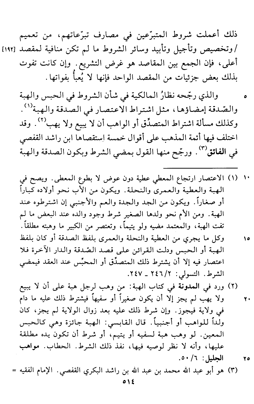 والذي رجّحه نظارُ المالكية في شأن الشروط في الحبس والهبة والصّدقة إمضاؤها، مثل اشتراط الاعتصار في الصدقة والهبة (¬1). وكذلك مسألة اشتراط المتصدِّق أو الواهب أن لا يبيع ولا يهب (¬2). وقد اختلف فيها أئمة المذهب على أقوال خمسة استقصاها ابن راشد القفصي في الفائق (¬3)، ورجّح منها القول بمضي الشرط وبكون الصدقة والهبة
