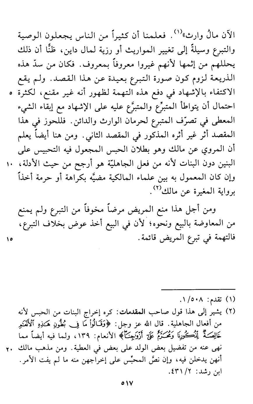 الآن مالُ وارث" (¬1). فعلمنا أن كثيراً من الناس يجعلون الوصية والتبرع وسيلةً إلى تغيير المواريث أو رزية لمال داين، ظنًّا أن ذلك يحللهم من إثمها لأنهم غيروا معروفاً بمعروف. فكان من سدّ هذه الذريعة لزوم كون صورة التبرع بعيدة عن هذا القصد. ولم يقع الاكتفاء بالإشهاد في دفع هذه التهمة لظهور أنه غير مقنع، لكثرة احتمال أن يتواطأ المتبرِّع والمتبرَّع عليه على الإشهاد مع إبقاء الشيء المعطى في تصرّف المتبرع لحرمان الوارث والدائن. فللحوز في هذا المقصد أثر غير أثره المذكور في المقصد الثاني. ومن هنا أيضاً يعلم أن المروي عن مالك وهو بطلان الحبس المجعول فيه التحبيس على البنين دون البنات لأنه من فعل الجاهليّة هو أرجح من حيث الأدلة، وإن كان المعمول به بين علماء المالكية مضيَّه بكراهة أو حرمة أخذاً برواية المغيرة عن مالك (¬2).