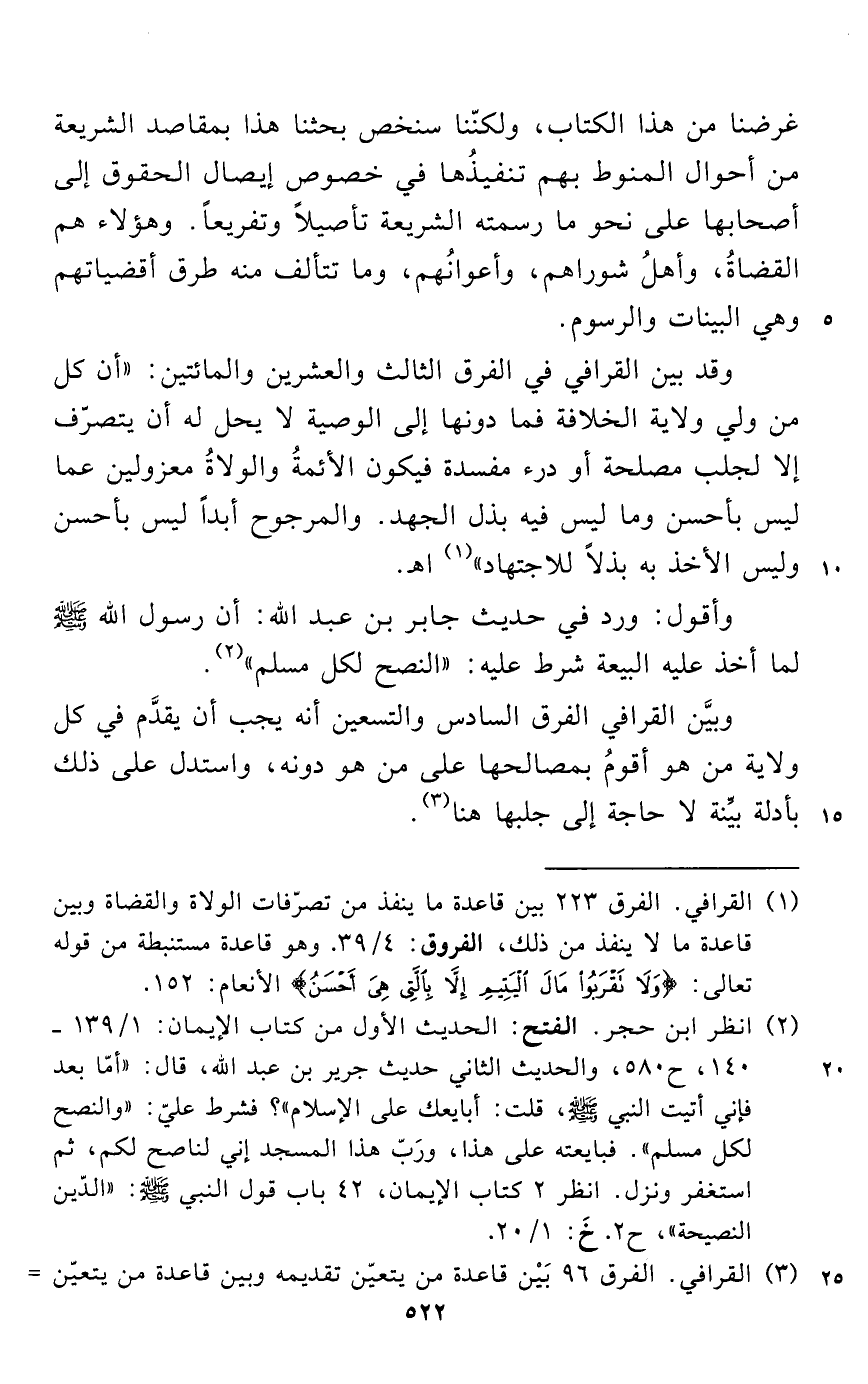 وقد بين القرافي في الفرق الثالث والعشرين والمائتين: "أن كل من ولي ولاية الخلافة فما دونها إلى الوصية لا يحل له أن يتصرّف إلا لجلب مصلحة أو درء مفسدة فيكون الأئمةُ والولاةُ معزولين عما ليس بأحسن وما ليس فيه بذل الجهد. والمرجوح أبداً ليس بأحسن وليس الأخذ به بذلاً للاجتهاد" (¬1) اهـ.