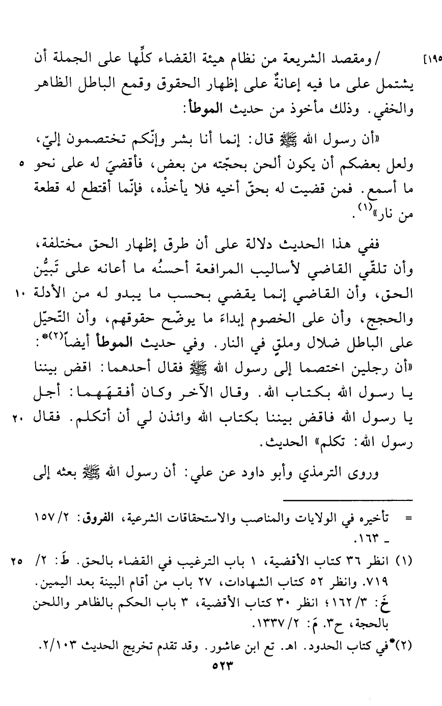 ومقصد الشريعة من نظام هيئة القضاء كلَّها على الجملة أن يشتمل على ما فيه إعانةٌ على إظهار الحقوق وقمع الباطل الظاهر والخفي. وذلك مأخوذ من حديث الموطأ: