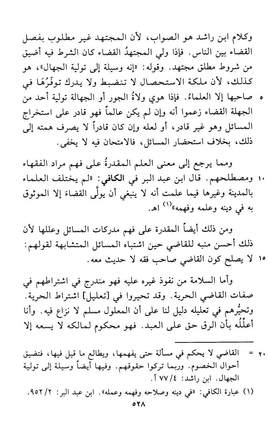 وكلام ابن راشد هو الصواب, لأن المجتهد غير مطلوب بفصل القضاء بين الناس. فإذا ولي المجتهدُ القضاء كان الشرط فيه أضيق من شروط مطلق مجتهد. وقوله: "إنه وسيلة إلى تولية الجهال"، هو كذلك, لأن ملكة الاستحصال لا تنضبط ولا يدرك توفّرُهَا في صاحبها إلا العلماءُ. فإذا هوي ولاةُ الجور أو الجهالة تولية أحد من الجهلة القضاء زعموا أنه وإن لم يكن عالماً فهو قادر على استخراج المسائل وهو غير قادر، أو لعله وإن كان قادراً لا يصرف همته إلى ذلك، بخلاف استحضار المسائل، فالامتحان فيه لا يخفى.