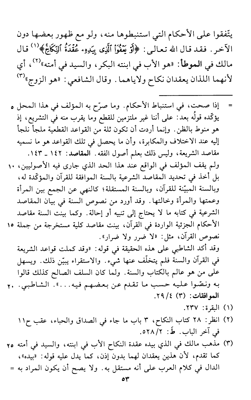 يتّفقوا على الأحكام التي استنبطوها منه، ولو مع ظهور بعضها دون الآخر. فقد قال الله تعالى: {أَوْ يَعْفُوَ الَّذِي بِيَدِهِ عُقْدَةُ النِّكَاحِ} (¬1) قال مالك في الموطأ: "هو الأب في ابنته البكر، والسيد في أمته" (¬2)، أي لأنهما اللذان يعقدان نكاح ولاياهما. وقال الشافعي: "هو الزوج" (¬3)