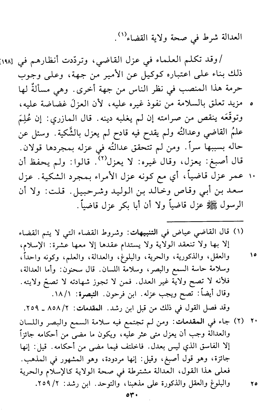 (¬2) جاء في المقدمات: ومن لم تجتمع فيه سلامة السمع والبصر واللسان والعدالة وجب أن يعزل متى عثر عليه، ويكون ما مضى من أحكامه جائزاً إلا الفاسق الذي ليس بعدل. فاختلف فيما مضى من أحكامه. قيل: إنها جائزة، وهو قول أصبغ، وقيل: إنها مردودة، وهو المشهور في المذهب. فعلى هذا القول، العدالة مشترطة في صحة الولاية كالإِسلام والحرية والبلوغ والعقل والذكورة على مذهبنا، والتوحد. ابن رشد: 2/ 259.