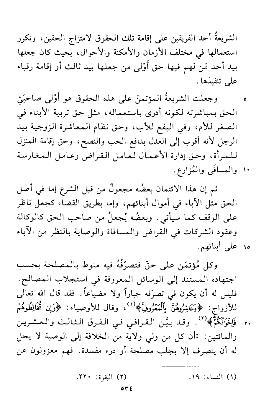 وكل مُؤتمَن على حقّ فتصرّفُهُ فيه منوط بالمصلحة بحسب اجتهاده المستند إلى الوسائل المعروفة في استجلاب المصالح. فليس له أن يكون في تصرّفه جباراً ولا مضياعاً. فقد قال الله تعالى للأزواج: {وَعَاشِرُوهُنَّ بِالْمَعْرُوفِ} (¬1)، وقال للأوصياء: {وَإِنْ تُخَالِطُوهُمْ فَإِخْوَانُكُمْ} (¬2). وقد بيَّن القرافي في الفرق الثالث والعشرين والمائتين: "أن كل من ولي ولاية من الخلافة إلى الوصية لا يحل له أن يتصرف إلا بجلب مصلحة أو درء مفسدة. فهم معزولون عن