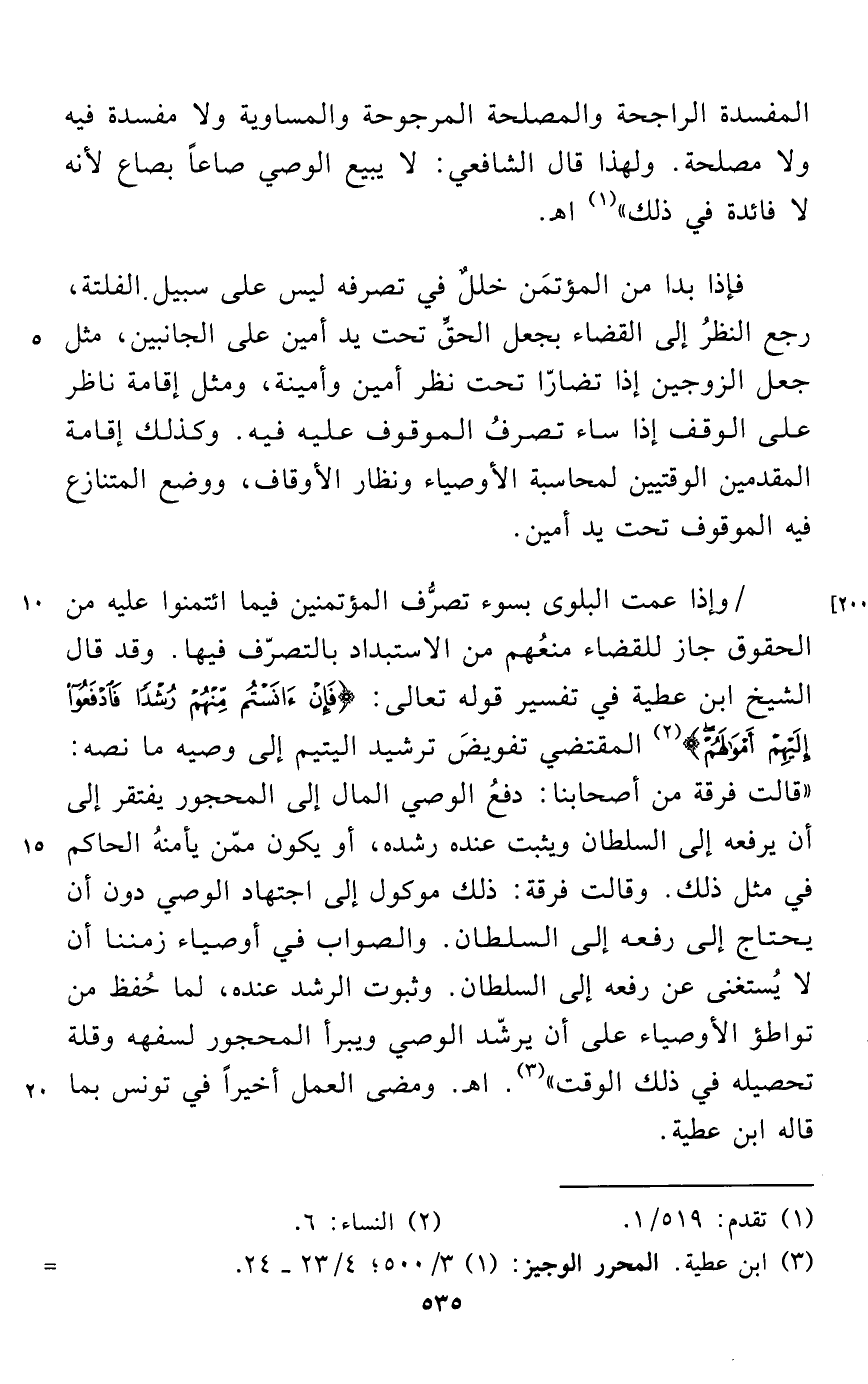وإذا عمت البلوى بسوء تصرُّف المؤتمنين فيما ائتمنوا عليه من الحقوق جاز للقضاء منعُهم من الاستبداد بالتصرّف فيها. وقد قال الشيخ ابن عطية في تفسير قوله تعالى: {فَإِنْ آنَسْتُمْ مِنْهُمْ رُشْدًا فَادْفَعُوا إِلَيْهِمْ أَمْوَالَهُمْ} (¬2) المقتضي تفويضَ ترشيد اليتيم إلى وصيه ما نصه: "قالت فرقة من أصحابنا: دفعُ الوصي المال إلى المحجور يفتقر إلى أن يرفعه إلى السلطان ويثبت عنده رشده، أو يكون ممّن يأمنهُ الحاكم في مثل ذلك. وقالت فرقة: ذلك موكول إلى اجتهاد الوصي دون أن يحتاج إلى رفعه إلى السلطان. والصواب في أوصياء زمننا أن لا يُستغنى عن رفعه إلى السلطان. وثبوت الرشد عنده، لما حُفظ من تواطؤ الأوصياء على أن يرشّد الوصي ويبرأ المحجور لسفهه وقلة تحصيله في ذلك الوقت" (¬3). اهـ. ومضى العمل أخيراً في تونس بما قاله ابن عطية.