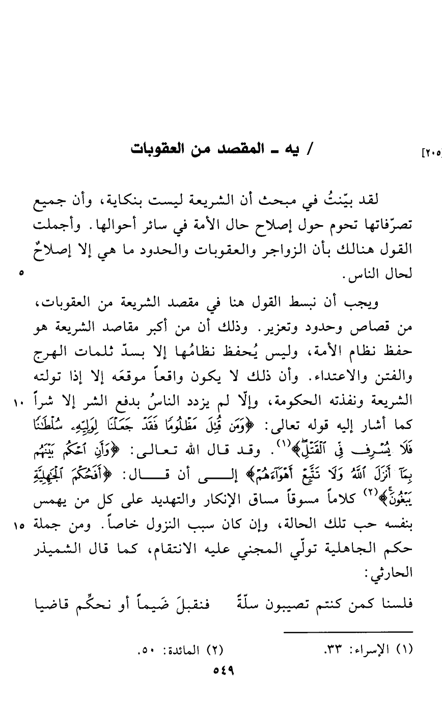 ويجب أن نبسط القول هنا في مقصد الشريعة من العقوبات، من قصاص وحدود وتعزير. وذلك أن من أكبر مقاصد الشريعة هو حفظ نظام الأمة، وليس يُحفظ نظامُها إلا بسدّ ثلمات الهرج والفتن والاعتداء. وأن ذلك لا يكون واقعاً موقعَه إلا إذا تولته الشريعة ونفذته الحكومة، وإلّا لم يزدد الناسُ بدفع الشر إلا شراً كما أشار إليه قوله تعالى: {وَمَنْ قُتِلَ مَظْلُومًا فَقَدْ جَعَلْنَا لِوَلِيِّهِ سُلْطَانًا فَلَا يُسْرِفْ فِي الْقَتْلِ} (¬1). وقد قال الله تعالى: {وَأَنِ احْكُمْ بَيْنَهُمْ بِمَا أَنْزَلَ اللَّهُ وَلَا تَتَّبِعْ أَهْوَاءَهُمْ} إلى أن قال: {أَفَحُكْمَ الْجَاهِلِيَّةِ يَبْغُونَ} (¬2) كلاماً مسوقاً مساق الإنكار والتهديد على كل من يهمس بنفسه حب تلك الحالة، وإن كان سبب النزول خاصاً. ومن جملة حكم الجاهلية تولّي المجني عليه الانتقام، كما قال الشميذر الحارثي: