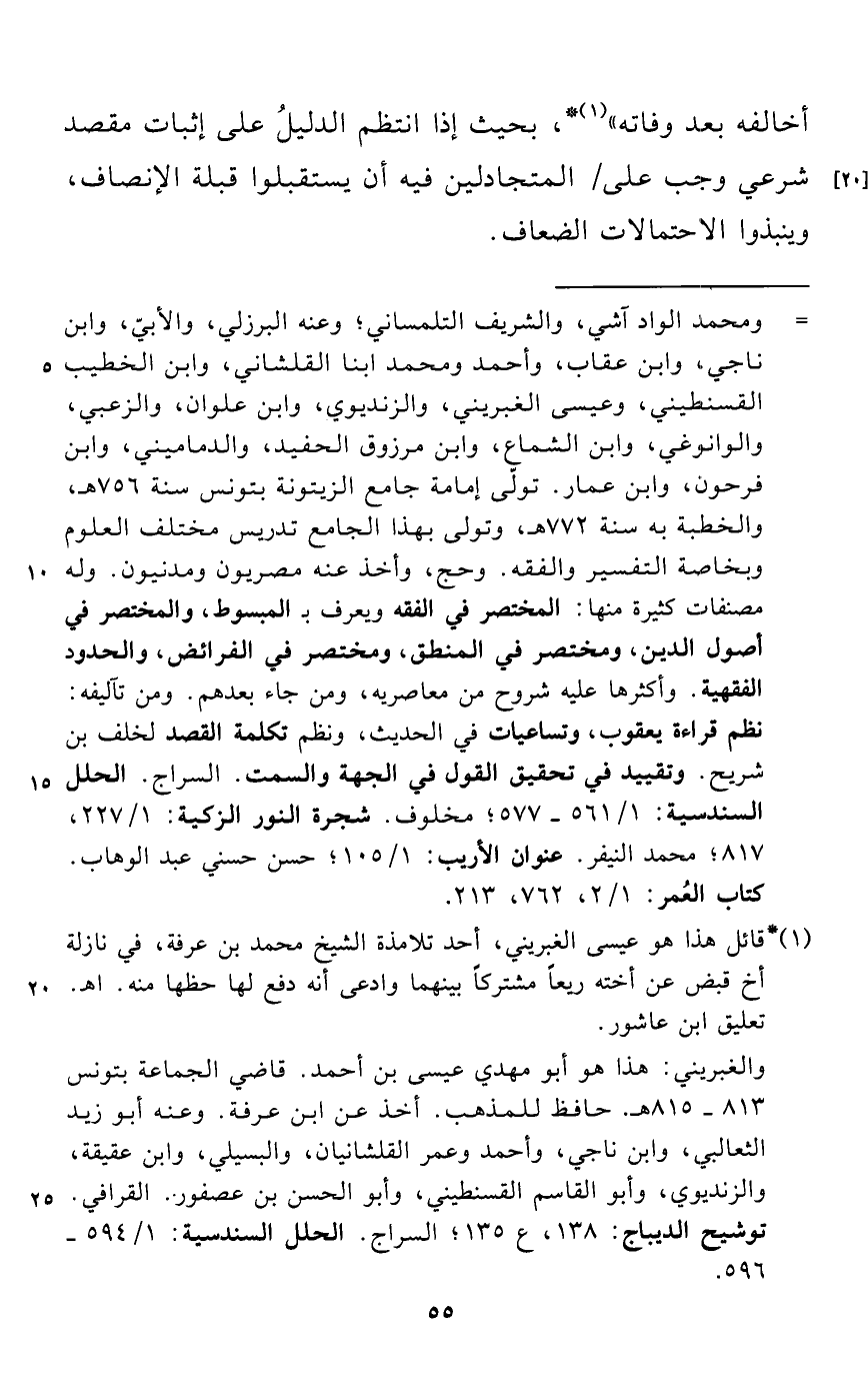 (¬1) قائل هذا هو عيسى الغبريني، أحد تلامذة الشيخ محمد بن عرفة، في نازلة أخ قبض عن أخته ريعاً مشتركاً بينهما وادعى أنه دفع لها حظها منه. اهـ. تعليق ابن عاشور.