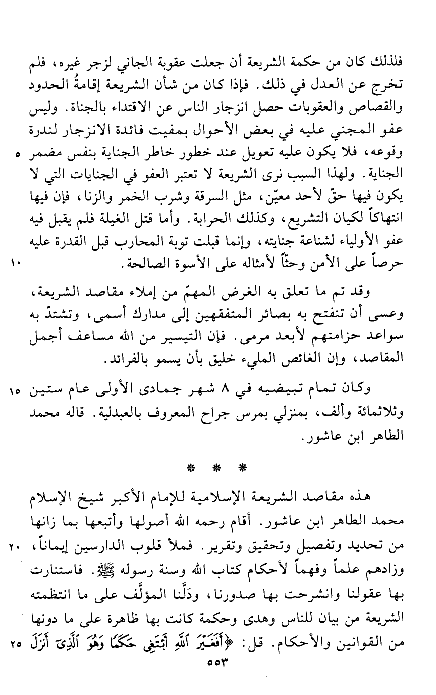 هذه مقاصد الشريعة الإِسلامية للإمام الأكبر شيخ الإِسلام محمَّد الطاهر ابن عاشور. أقام رحمه الله أصولها وأتبعها بما زانها من تحديد وتفصيل وتحقيق وتقرير. فملأ قلوب الدارسين إيماناً، وزادهم علماً وفهماً لأحكام كتاب الله وسنة رسوله - صلى الله عليه وسلم -. فاستنارت بها عقولنا وانشرحت بها صدورنا، ودَلَّنا المؤلَّف على ما انتظمته الشريعة من بيان للناس وهدى وحكمة كانت بها ظاهرة على ما دونها من القوانين والأحكام.