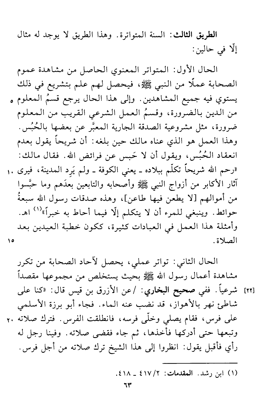 الحال الأول: المتواتر المعنوي الحاصل من مشاهدة عموم الصحابة عملًا من النبي - صلى الله عليه وسلم -، فيحصل لهم علم بتشريع في ذلك يستوي فيه جميع المشاهدين. وإلى هذا الحال يرجع قسمُ المعلوم من الدين بالضرورة، وقسمُ العمل الشرعي القريب من المعلوم ضرورة، لمثل مشروعية الصدقة الجارية المعبَّر عن بعضها بالحُبُس. وهذا العمل هو الذي عناه مالك حين بلغه: أن شريحاً يقول بعدم انعقاد الحُبُس، ويقول أن لا حَبس عن فرائض الله. فقال مالك: "رحم الله شريحاً تكلّم ببلاده - يعني الكوفة - ولم يَرِد المدينة، فيرى آثار الأكابر من أزواج النبي - صلى الله عليه وسلم - وأصحابه والتابعين بعدَهم وما حبَّسوا من أموالهم [لا يطعن فيها طاعن]، وهذه صدقات رسول الله سبعةُ حوائط. وينبغي للمرء أن لا يتكلم إلا فيما أحاط به خبراً" (¬1) اهـ. وأمثلة هذا العمل في العبادات كثيرة، ككون خطبة العيدين بعد الصلاة.