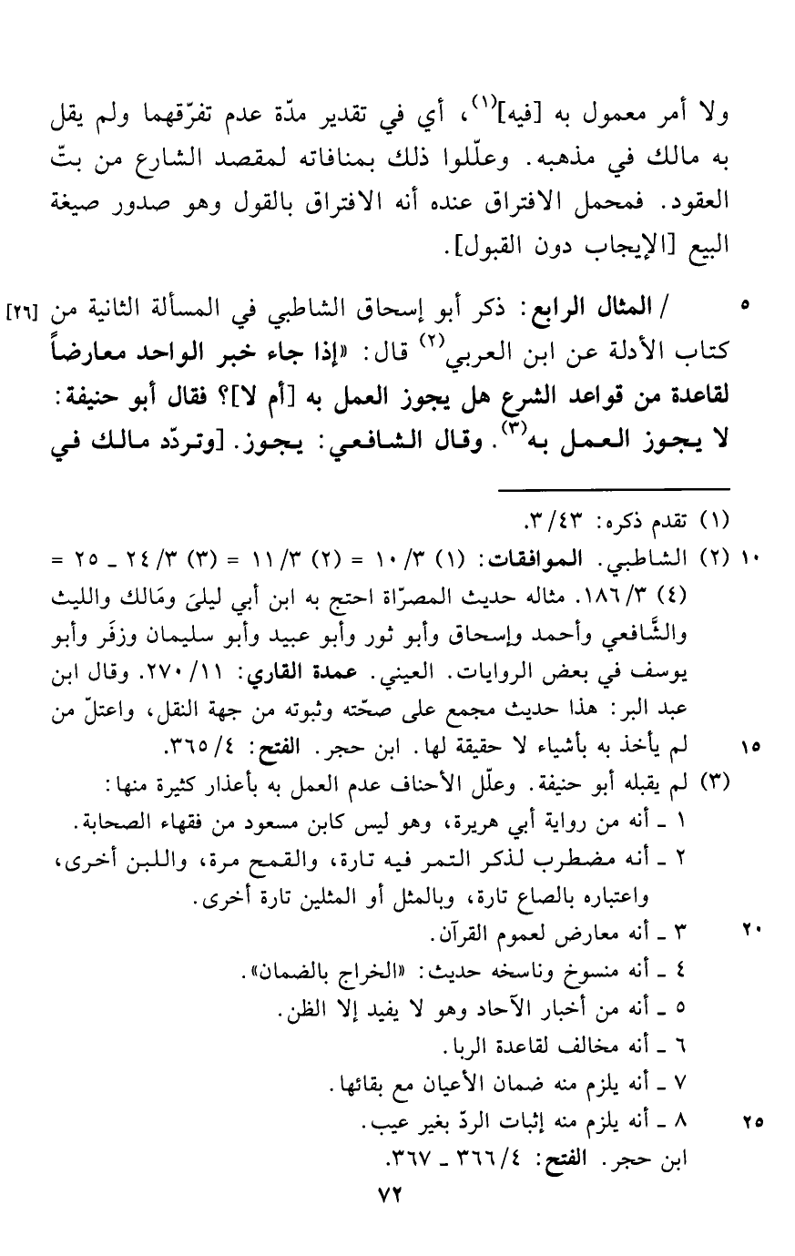 (¬2) الشاطبي. الموافقات: (1) 3/ 10 = (2) 3/ 11 = (3) 3/ 24 - 25 = (4) 3/ 186. مثاله حديث المصرّاة احتج به ابن أبي ليلىَ ومَالك والليث والشَّافعي وأحمد وإسحاق وأبو ثور وأبو عبيد وأبو سليمان وزفَر وأبو يوسف في بعض الروايات. العيني. عمدة القاري: 11/ 270. وقال ابن عبد البر: هذا حديث مجمع على صحّته وثبوته من جهة النقل، واعتل من لم يأخذ به بأشياء لا حقيقة لها. ابن حجر. الفتح: 4/ 365.