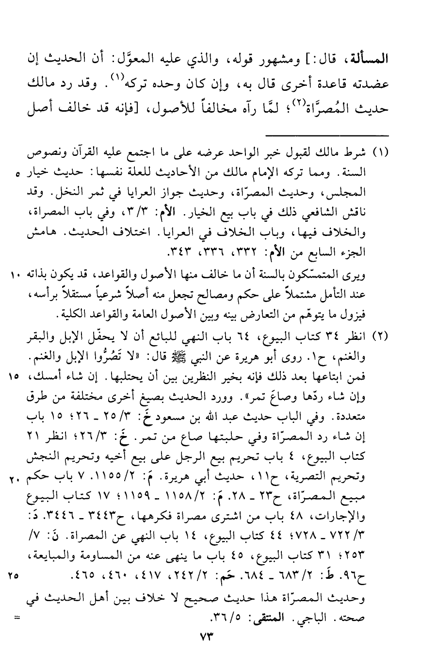 (¬1) شرط مالك لقبول خبر الواحد عرضه على ما اجتمع عليه القرآن ونصوص السنة. ومما تركه الإمام مالك من الأحاديث للعلة نفسها: حديث خيار المجلس، وحديث المصرّاة، وحديث جواز العرايا في ثمر النخل. وقد ناقش الشافعي ذلك في باب بيع الخيار. الأم: 3/ 3، وفي باب المصراة، والخلاف فيها، وباب الخلاف في العرايا. اختلاف الحديث. هامش الجزء السابع من الأم: 332، 336، 343.