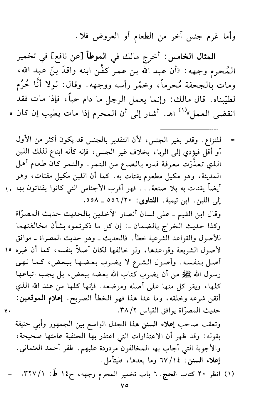 المثال الخامس: أخرج مالك في الموطأ [عن نافع] في تخمير المُحرم وجهه: "أن عبد الله بن عمر كفَّن ابنه واقدَ بنَ عبد الله، ومات بالجحفة مُحرماً، وخمّر رأسه ووجهه. وقال: لولا أنَّا حُرُم لطيّبناه. قال مالك: وإنما يعمل الرجل ما دام حياً، فإذا مات فقد انقضى العمل" (¬1) اهـ. أشار إلى أن المحرم إذا مات يطيب إن كان