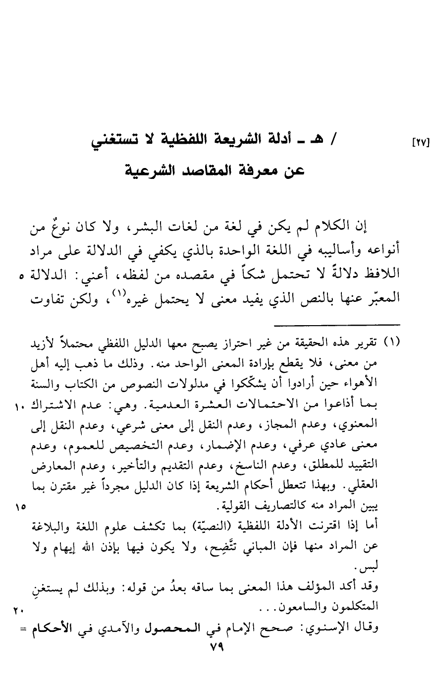 (¬1) تقرير هذه الحقيقة من غير احتراز يصبح معها الدليل اللفظي محتملاً لأزيد من معنى، فلا يقطع بإرادة المعنى الواحد منه. وذلك ما ذهب إليه أهل الأهواء، حين أرادوا أن يشكّكوا في مدلولات النصوص من الكتاب والسنة بما أذاعوا من الاحتمالات العشرة العدمية. وهي: عدم الاشتراك المعنوي، وعدم المجاز، وعدم النقل إلى معنى شرعي، وعدم النقل إلى معنى عادي عرفي، وعدم الإضمار، وعدم التخصيص للعموم، وعدم التقييد للمطلق، وعدم الناسخ، وعدم التقديم والتأخير، وعدم المعارض العقلي. وبهذا تتعطل أحكام الشريعة إذا كان الدليل مجرداً غير مقترن بما يبين المراد منه كالتصاريف القولية.