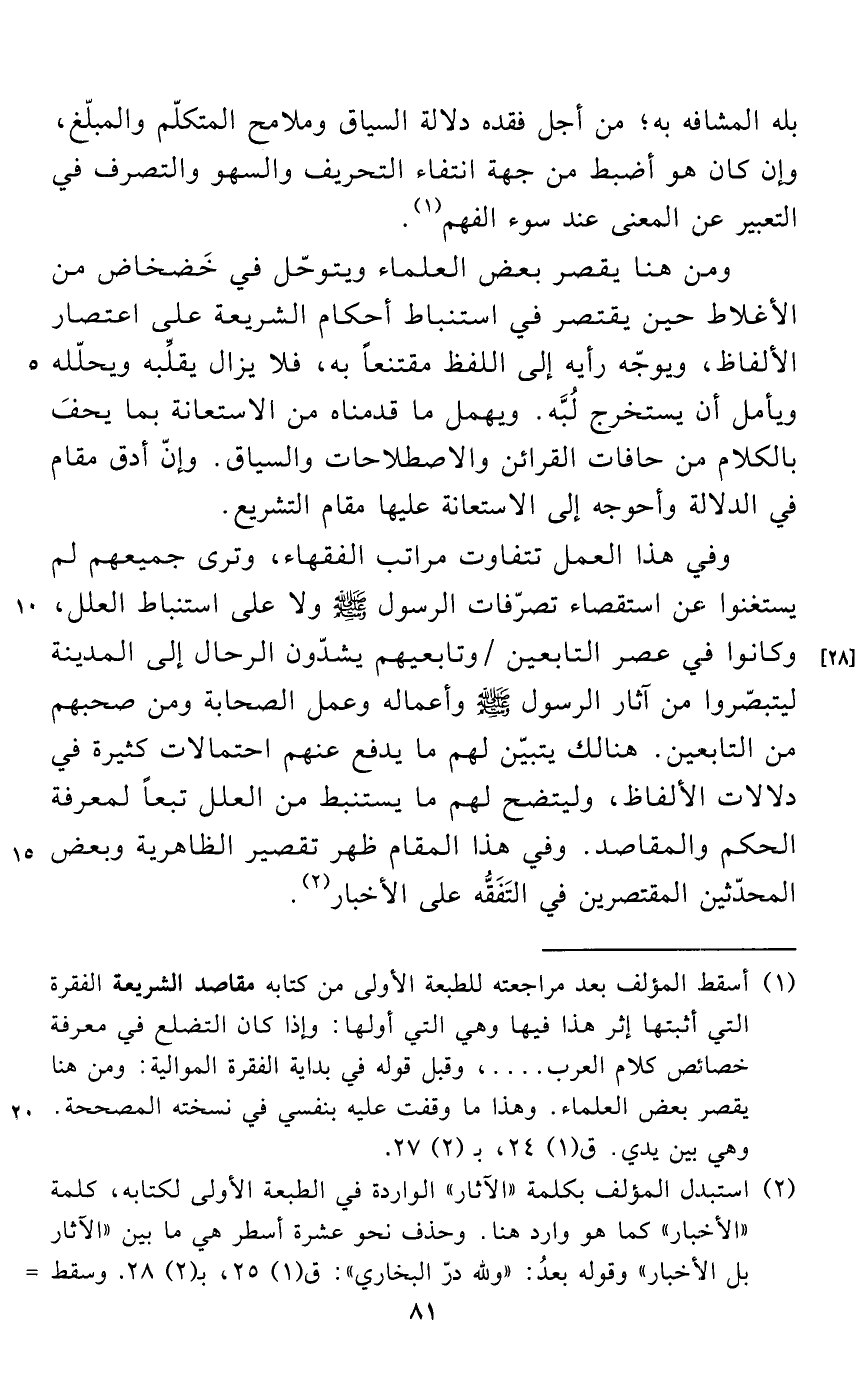 (¬1) أسقط المؤلف بعد مراجعته للطبعة الأولى من كتابه مقاصد الشريعة الفقرة التي أثبتها إثر هذا فيها وهي التي أولها: وإذا كان التضلع في معرفة خصائص كلام العرب .... ، وقبل قوله في بداية الفقرة الموالية: ومن هنا يقصر بعض العلماء. وهذا ما وقفت عليه بنفسي في نسخته المصححة. وهي بين يدي. ق (1) 24، بـ (2) 27.