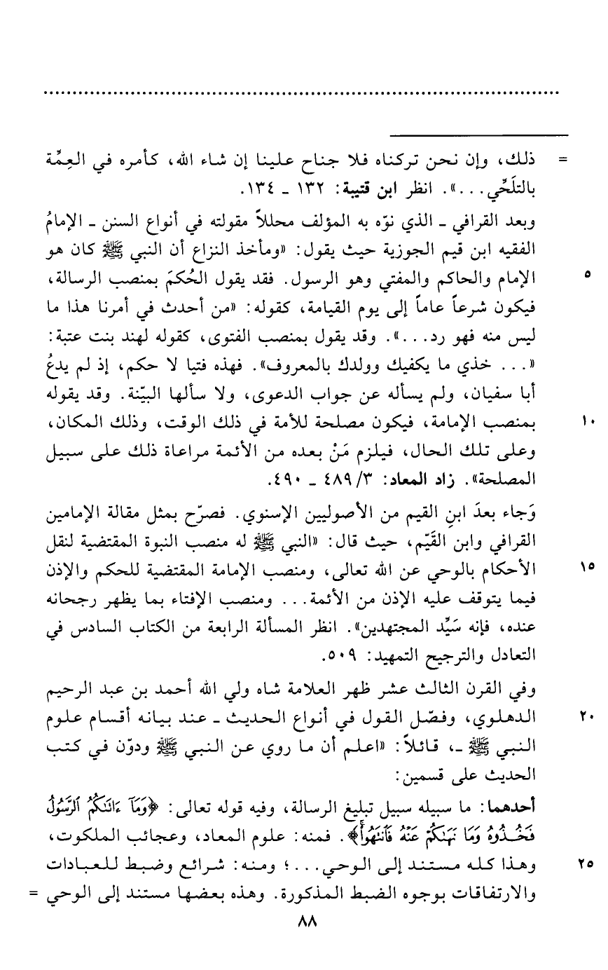 وبعد القرافي - الذي نوّه به المؤلف محللاً مقولته في أنواع السنن - الإمامُ الفقيه ابن قيم الجوزية حيث يقول: "ومأخذ النزاع أن النبي - صلى الله عليه وسلم - كان هو الإمام والحاكم والمفتي وهو الرسول. فقد يقول الحُكمَ بمنصب الرسالة، فيكون شرعاً عاماً إلى يوم القيامة، كقوله: "من أحدث في أمرنا هذا ما ليس منه فهو رد ... ". وقد يقول بمنصب الفتوى، كقوله لهند بنت عتبة: " ... خذي ما يكفيك وولدك بالمعروف". فهذه فتيا لا حكم، إذ لم يدعُ أبا سفيان، ولم يسأله عن جواب الدعوى، ولا سألها البيّنة. وقد يقوله بمنصب الإمامة، فيكون مصلحة للأمة في ذلك الوقت، وذلك المكان، وعلى تلك الحال، فيلزم مَنْ بعده من الأئمة مراعاة ذلك على سبيل المصلحة". زاد المعاد: 3/ 489 - 490.