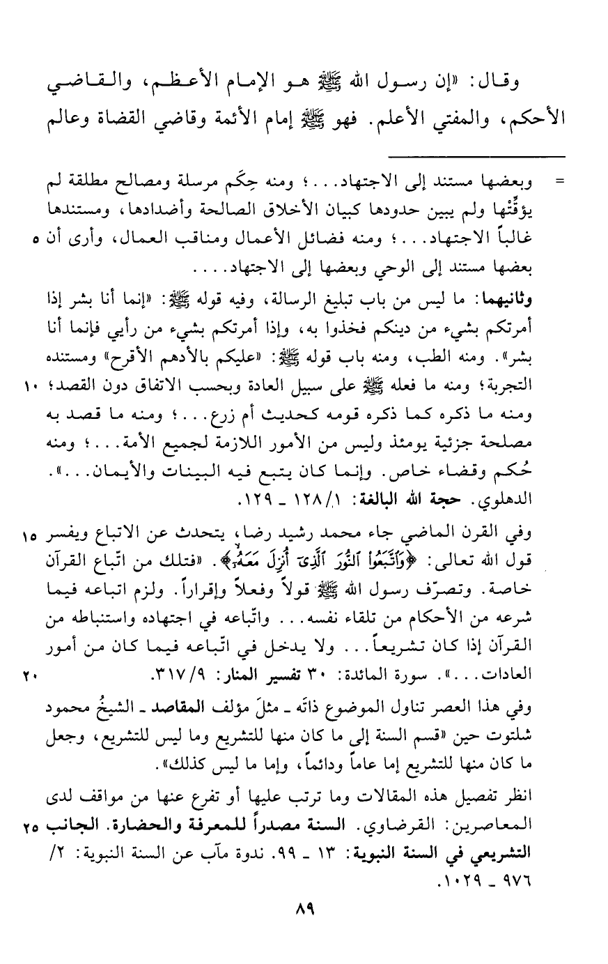 وثانيهما: ما ليس من باب تبليغ الرسالة، وفيه قوله - صلى الله عليه وسلم -: "إنما أنا بشر إذا أمرتكم بشيء من دينكم فخذوا به، وإذا أمرتكم بشيء من رأيي فإنما أنا بشر". ومنه الطب، ومنه باب قوله - صلى الله عليه وسلم -: "عليكم بالأدهم الأقرح" ومستنده التجربة؛ ومنه ما فعله - صلى الله عليه وسلم - على سبيل العادة وبحسب الاتفاق دون القصد؛ ومنه ما ذكره كما ذكره قومه كحديث أم زرع ... ؛ ومنه ما قصد به مصلحة جزئية يومئذ وليس من الأمور اللازمة لجميع الأمة ... ؛ ومنه حُكم وقضاء خاص. وإنما كان يتبع فيه البينات والأيمان ... ". الدهلوي. حجة الله البالغة: 1/ 128 - 129.