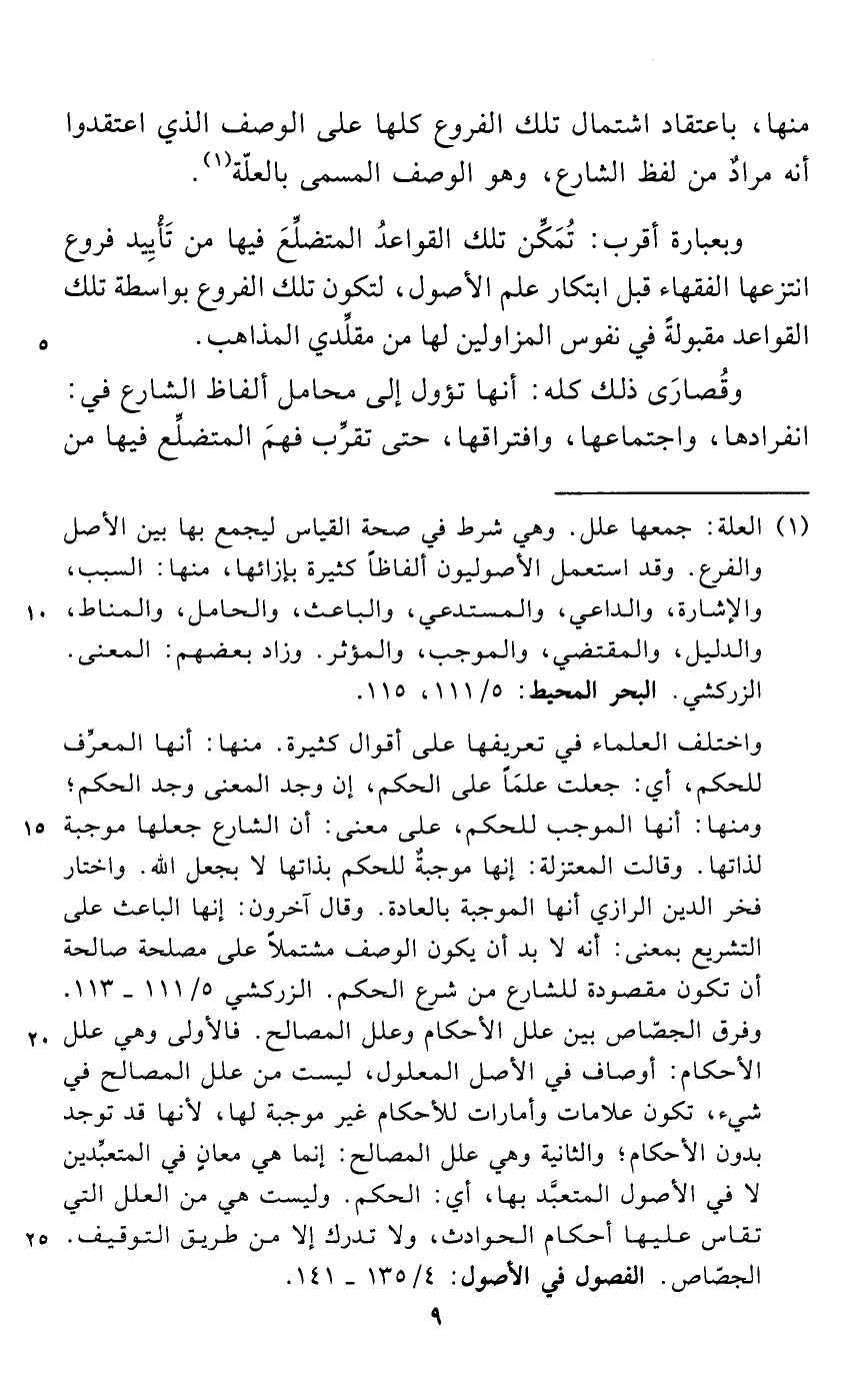 (¬1) العلة: جمعها علل. وهي شرط في صحة القياس ليجمع بها بين الأصل والفرع. وقد استعمل الأصوليون ألفاظاً كثيرة بإزائها، منها: السبب، والإشارة، والداعي، والمستدعي، والباعث، والحامل، والمناط، والدليل، والمقتضي، والموجب، والمؤثر. وزاد بعضهم: المعنى. الزركشي. البحر المحيط: 5/ 111، 115.