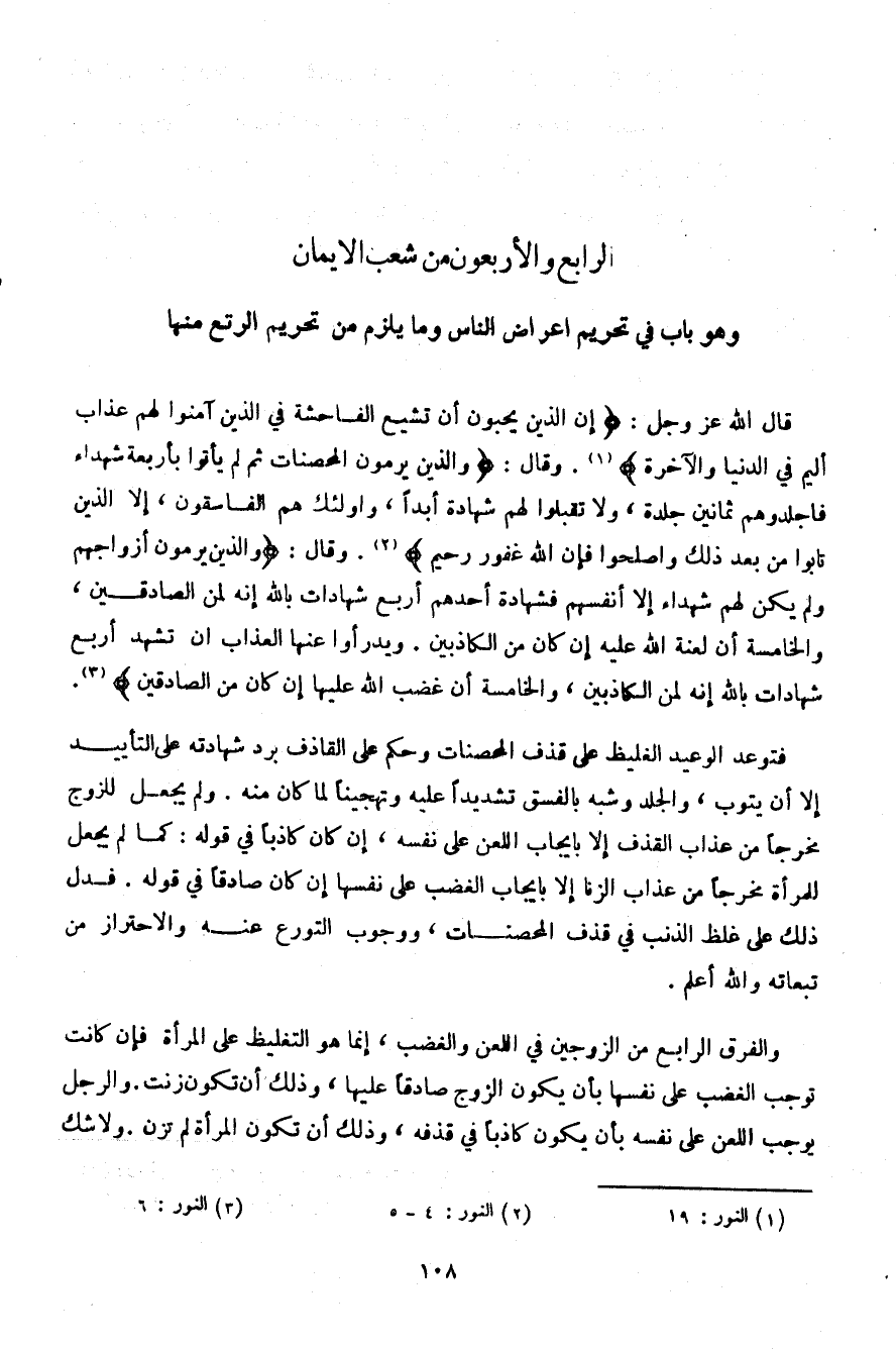 قال الله عز وجل: {إن الذين يحبون أن تشيع الفاحشة في الذين آمنوا لهم عذاب أليم في الدنيا والآخرة}. وقال: {والذين يرمون المحصنات ثم لم يأتوا بأربعة شهداء فاجلدوهم ثمانين جلدة، ولا تقبلوا لهم شهادة أبدًا، وأولئك هم الفاسقون، إلا الذين تابوا من بعد ذلك وأصلحوا فإن الله غفور رحيم}. وقال: {والذين يرمون أزواجهم ولم يكن لهم شهداء إلا أنفسهم فشهادة أحدهم أربع شهادات بالله إنه لمن الصادقين، والخامسة أن لعنة الله عليه إن كان من الكاذبين. ويدرأوا عنها العذاب أن تشهد أربع شهادات بالله إنه لمن الكاذبين، والخامسة أن غضب الله عليها إن كان من الصادقين}.