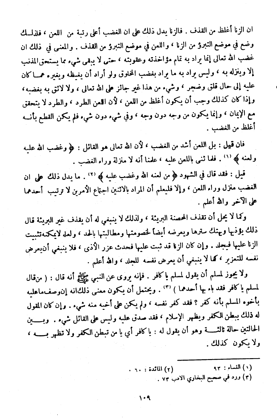 أن الزنا أغلظ من القذف. فالزنا يدل ذلك على أن الغضب أعلى رتبة من اللعن، فلذلك وضع في موضع التبرؤ من الزنا، واللعن في موضع التبرؤ من القذف. والمعنى في ذلك أن الله تعالى إنما يراد به تمام مؤاخذته وعقوبته، حتى لا يبقى شيء مما يستحق المذنب إلا وينزله به، وليس يراد به ما يراد بغضب المخلوق ولو أراد أن يغيظه ويغيره عما كان عليه إلى حال قلق وضجر، وشيء من هذا غير جائز على الله تعالى، ولا لائق به بغضبه، وإذا كان كذلك وجب أن يكون أغلظ من اللعن، لأن اللعن الطرد، والطرد لا يتحقق مع الإيمان، وإنما يكون من وجه دون وجه، وفي شيء دون شيء فلم يكن القطع بأنه أغلظ من الغضب.
