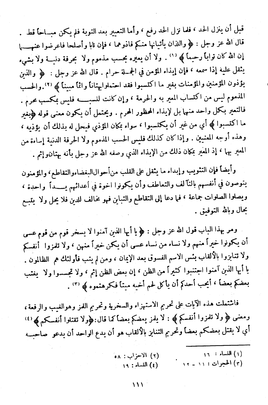ومر بهذا الباب قول الله عز وجل: {يا أيها الذين آمنوا لا يسخر قوم من قوم عسى أن يكونوا خيرًا منهم ولا نساء من نساء عسى أن يكن خيرًا منهن، ولا تلمزوا أنفسكم ولا تنابزوا بالألقاب بئس الاسم الفسوق بعد الإيمان، ومن لم يتب فأولئك هم الظالمون. يا أيها الذين آمنوا اجتنبوا كثيرًا من الظن، إن بعض الظن إثم، ولا تجسسوا ولا يغتب بعضكم بعضًا، أيحب أحدكم أن يأكل لحم أخيه ميتًا فكرهتموه}.