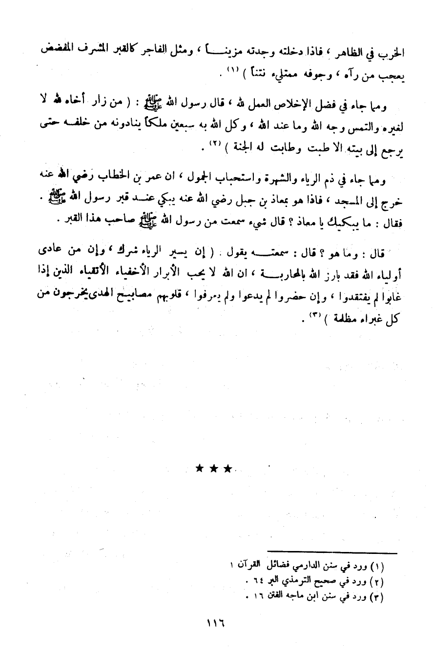 قال: وما هو؟ قال: سمعته يقول: (إن يسير الرياء شرك، وإن من عادي أولياء الله فقد بارز الله بالمحاربة، إن الله لا يحب الأبرار الأخفياء الأتقياء الذين إذا غابوا لم يفتقدوا، وإن حضروا لم يدعوا ولم يعرفوا، قلوبهم مصابيح الهدى يخرجون من كل غبراء مظلمة).