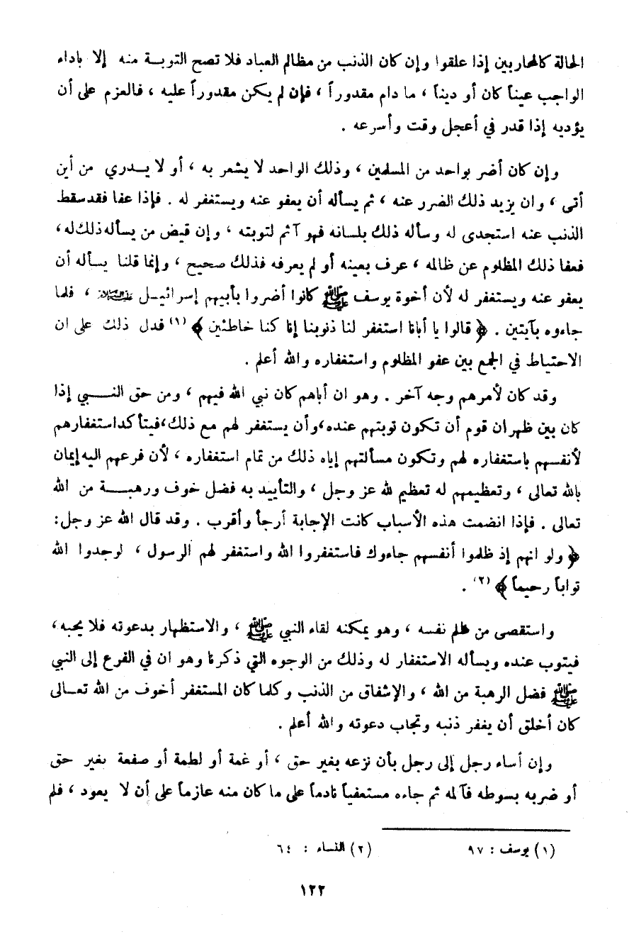 وإن كان أضر بواحد من المسلمين، وذلك الواحد لا يشعر به، أو لا يدري من أين أتى، وإن يزيد ذلك الضرر عنه، ثم يسأله أن يعفو عنه ويستغفر له. فإذا عفا فقد سقط الذنب عنه استجدى له وسأله ذلك بلسانه فهو آثم لتوبته، وإن قيض من يسأله ذلك له، فعفا ذلك المظلوم عن ظالمه، عرف بعينه أو لم يعرفه فذلك صحيح، وإنما قلنا يسأله أن يعفو عنه ويستغفر له لأن أخوة يوسف صلى الله عليه وسلم كانوا أضروا بأبيهم إسرائيل عليه السلام، فلما جاءوه بآيتين. {قالوا يا أبانا استغفر لنا ذنوبنا إنا كنا خاطئين} فدل ذلك على أن الاحتياط في الجمع بين عفو المظلوم واستغفاره والله أعلم.