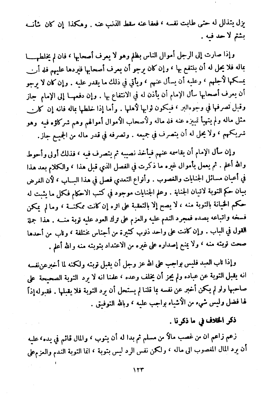 وإن سأل الإمام أن يقاسمه عنهم فيأخذ نصيبه ثم يتصرف فيه، فذلك أولى وأحوط والله أعلم. ثم يعمل بأموال غيره ما ذكرت في الفصل الذي قبل هذا، والكلام بعد هذا في أعيان مسائل الجنايات والغصوب. وأنواع التعدي فصل في هذا الباب، لأن الغرض بيان حكم التوبة لإتيان الجناية. وعلم الجنايات موجود في كتب الأحكام فكل ما يثبت له حكم الخيانة بالتوبة منه، لا يصح إلا بالتعقبة على أثره إن كانت ممكنة، وما لم يمكن فسخه واتباعه بصده فمجرد الندم عليه والعزم على ترك العود عليه توبة منه. هذا جملة القول في الباب. وإن كانت على واحد ذنوب كثيرة من أجناس مختلفة، وتاب من أحدها صحت توبته منه، ولا يمنع إصداره على غيره من الاعتداد بتوبته منه والله أعلم.