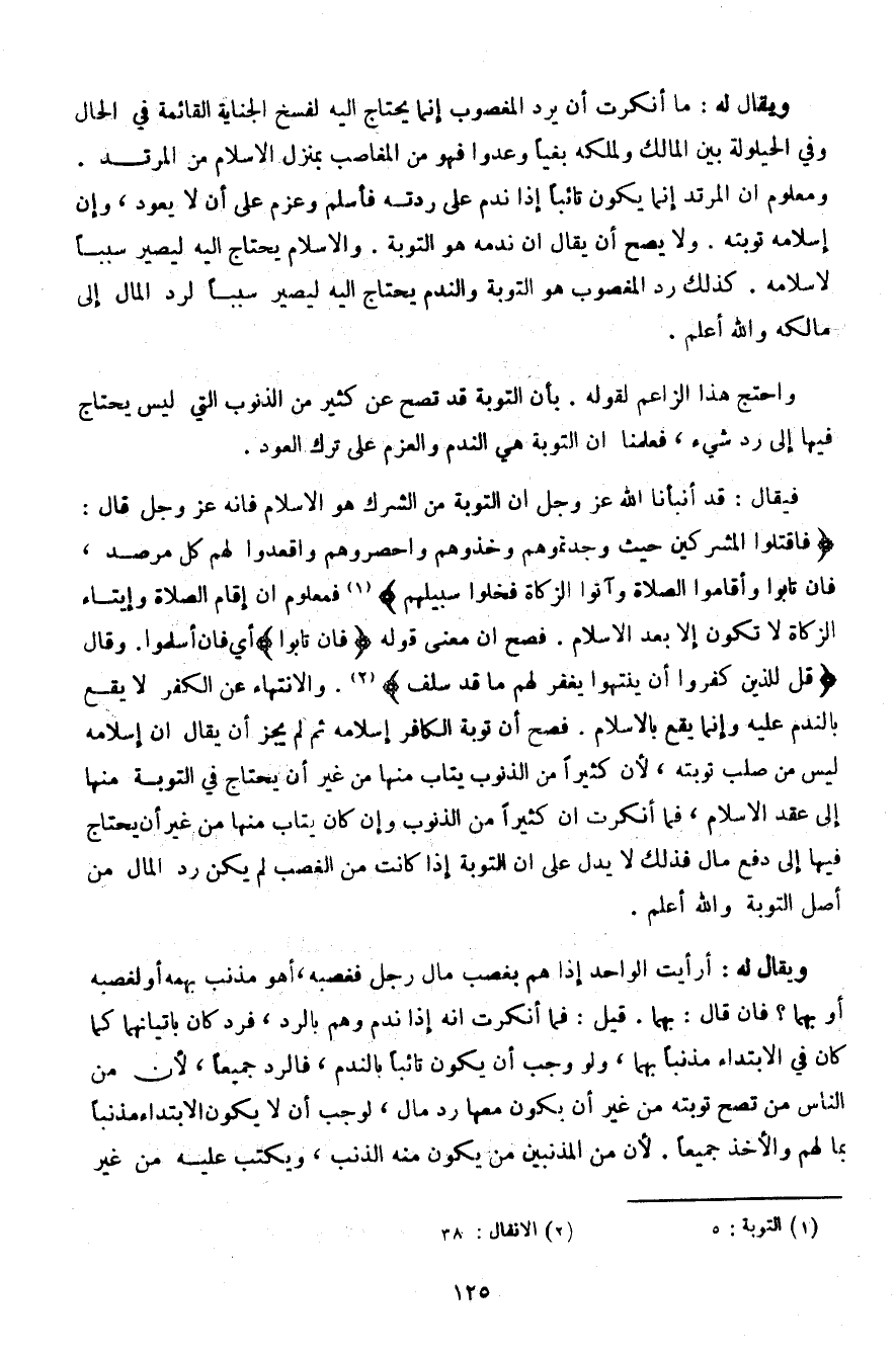 فيقال: قد أنبأنا الله عز وجل أن التوبة من الشرك هو الإسلام فإنه عز وجل قال: {فاقتلوا المشركين حيث وجدتموهم وخذوهم واحصروهم واقعدوا لهم كل مرصد، فإن تابوا وأقاموا الصلاة وآتوا الزكاة فخلوا سبيلهم} فمعلوم أن إقام الصلاة وإيتاء الزكاة لا تكون إلا بعد الإسلام. فصح أن معنى قوله {فإن تابوا} أي فإن أسلموا. وقال {قل للذين كفروا أن ينتهوا يغفر لهم ما قد سلف}. والانتهاء عن الكفر لا يقع بالندم عليه وإنما يقع بالإسلام. فصح أن توبة الكافر إسلامه ثم لم يجز أن يقال أن إسلامه ليس من صلب توبته، لأن كثيرًا من الذنوب يتاب منها من غير أن يحتاج في التوبة منها إلى عقد الإسلام، فما أنكرت أن كثيرًا من الذنوب وإن كان يتاب منها من غير أن يحتاج فيها إلى دفع مال فذلك لا يدل على أن التوبة إذا كانت من الغصب لم يكن رد المال من أصل التوبة والله أعلم.
