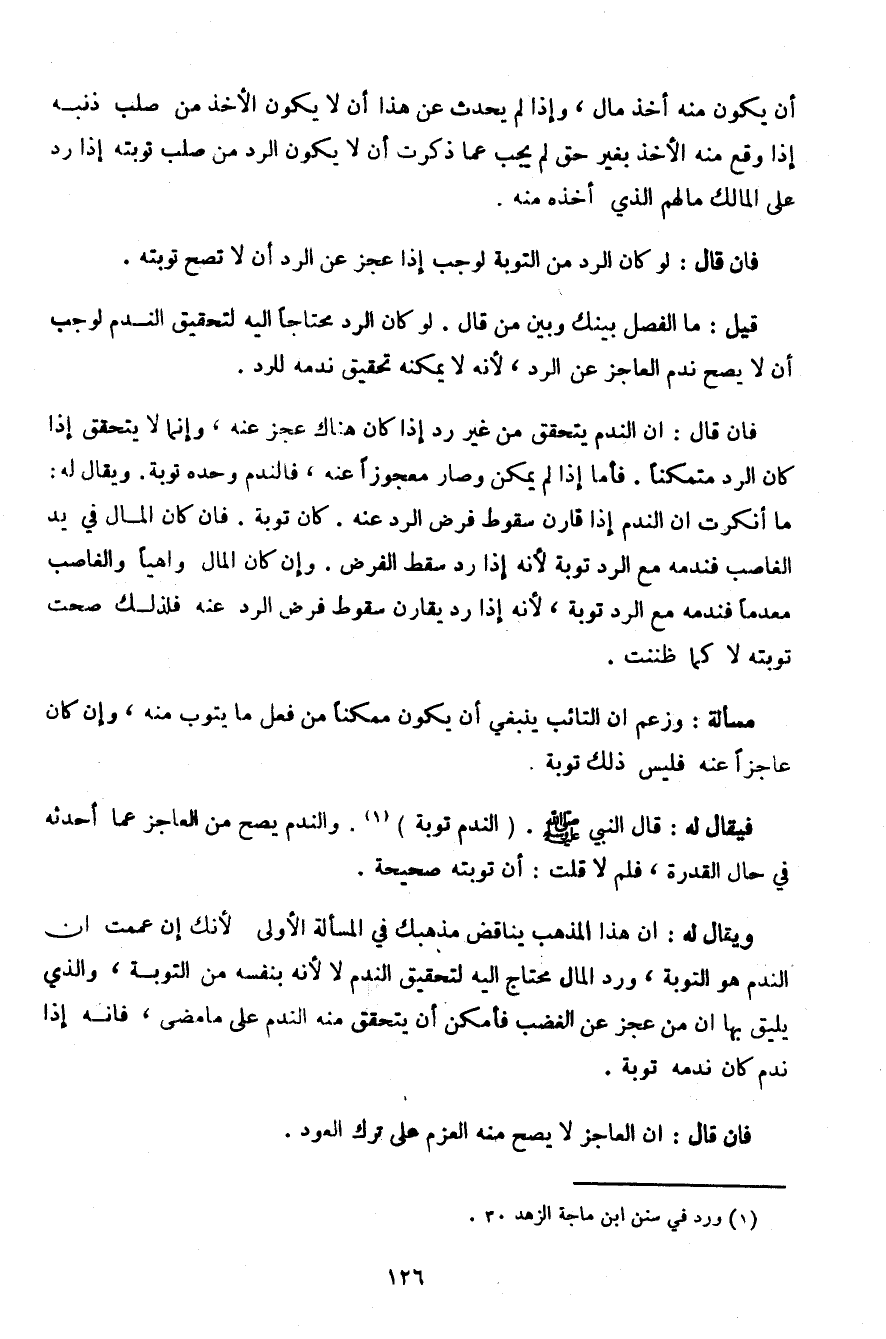 ويقال له: إن هذا المذهب يناقض مذهبك في المسألة الأولى لأنك إن عممت أن الندم هو التوبة، ورد المال محتاج إليه لتحقيق الندم لا لأنه بنفسه من التوبة، والذي يليق بها إن من عجز عن الغضب فأمكن أن يتحقق منه الندم على ما مضى، فإنه إذا ندم كان ندمه توبة.