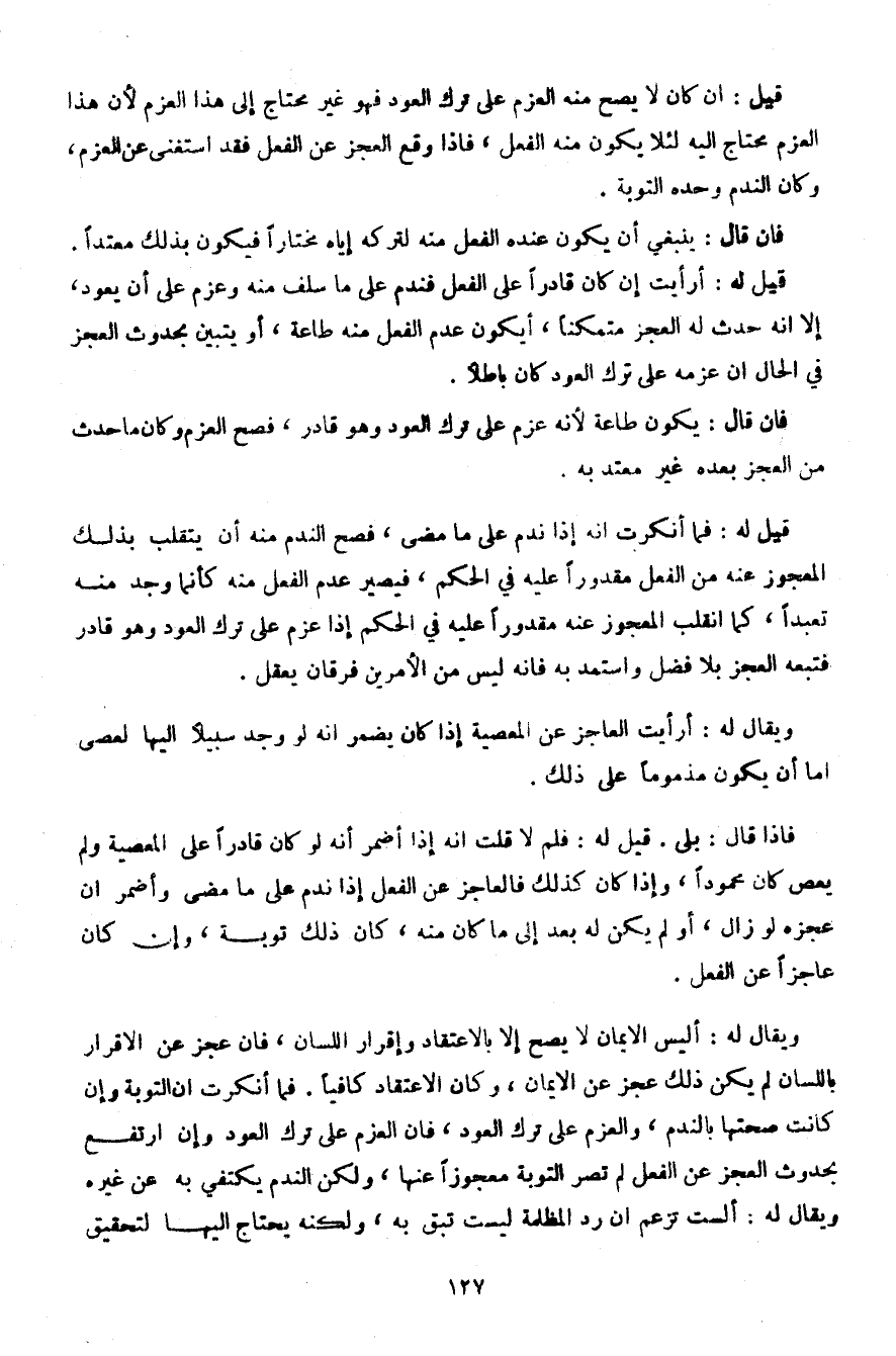 قيل له: فما أنكرت أنه إذا ندم على ما مضى، فصح الندم منه أن يتقلب بذلك المعجوز عنه من الفعل مقدورًا عليه في الحكم، فيصير عدم الفعل منه كأنما وجد منه تعبدًا، كما انقلب المعجوز عنه مقدورًا عليه في الحجم فإذا عزم على ترك العود وهو قادر فتبعه العجز بلا فضل واستمد به فإنه ليس من الأمرين فرقان يعقل.
