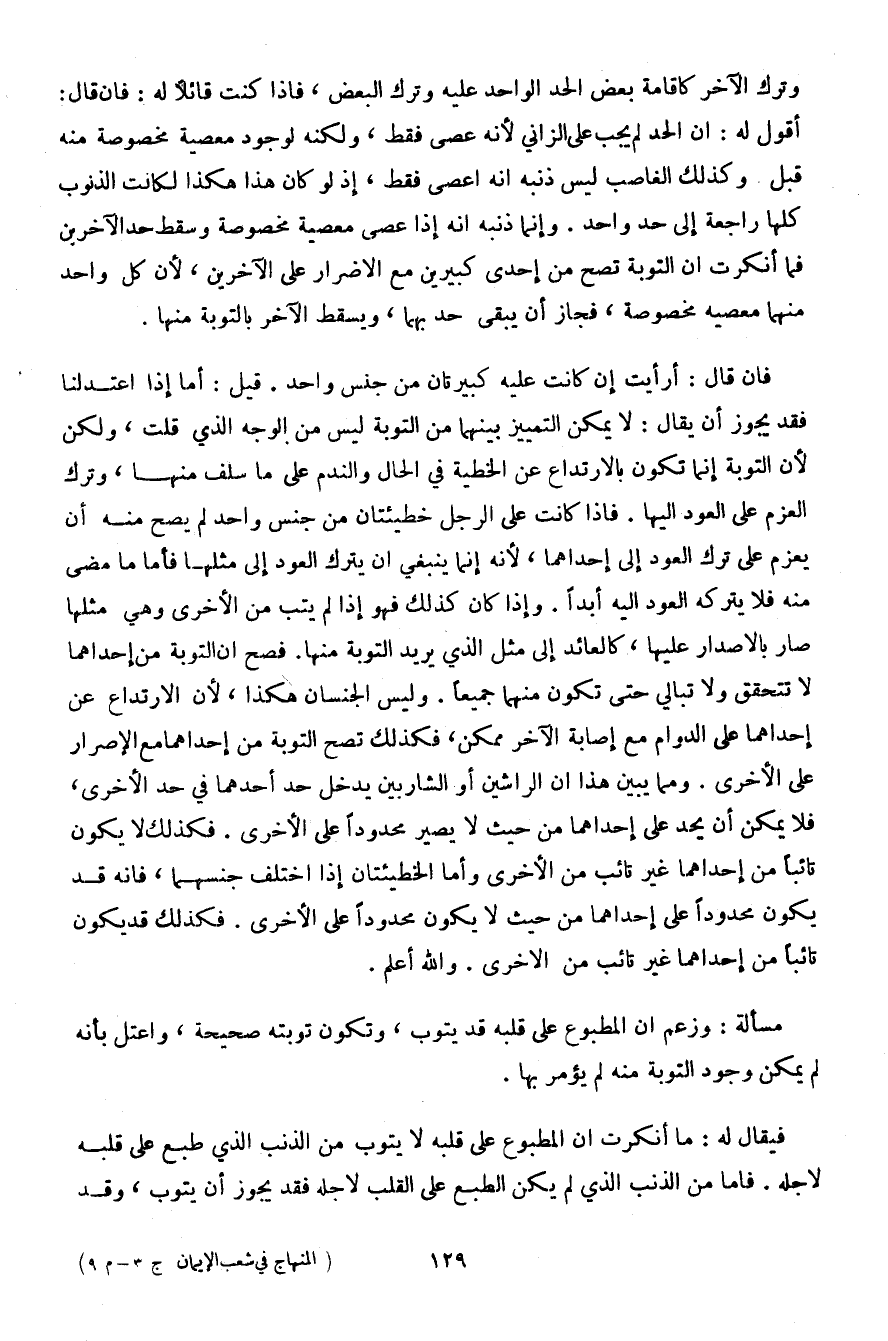 فإن قال: أرأيت إن كانت عليه كبيرتان من جنس واحد. قيل: أما إذا اعتدلنا فقد يجوز أن يقال: لا يمكن التمييز بينهما من التوبة ليس من الوجه الذي قلت، ولكن لأن التوبة إنما تكون بالارتداع عن الخطية في الحال والندم على ما سلف منها، وترك العزم على العود إليها. فإذا كانت على الرجل خطيئتان من جنس واحد لم يصح منه أن يعزم على ترك العود إلى إحداهما، لأنه إنما ينبغي أن يترك العود إلى مثلها فأما ما مضى منه فلا يتركه العود إليه أبدًا. وإذا كان كذلك فهو إذا لم يتب من الأخرى وهي مثلها صار بالإصدار عليها، كالعائد إلى مثل الذي يريد التوبة منها. فصح أن التوبة من إحداهما لا تتحقق ولا تبالي حتى تكون منهما جميعًا. وليس الجنسان هكذا، لأن الارتداع عن إحداهما على الدوام مع إصابة الآخر ممكن، فكذلك تصح التوبة من إحداهما مع الإصرار على الأخرى. ومما يبين هذا أن الراشين أو الشاربين يدخل حد أحدهما في حد الأخرى، فلا يمكن أن يحد على إحداهما من حيث لا يصير محدودًا على الأخرى. فكذلك لا يكون تائبًا من إحداهما غير تائب من الأخرى وأما الخطيئتان إذا اختلف جنسهما، فإنه قد يكون محدودًا على إحداهما من حيث لا يكون محدودًا على الأخرى. فكذلك قد يكون تائبًا من إحداهما غير تائب من الأخرى. والله أعلم.