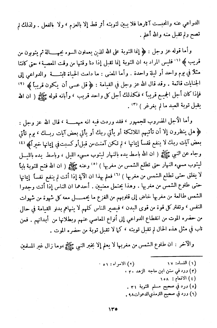 وأما الأجل المضروب للجمهور، فقد وردت فيه أنه مهمة، قال الله عز وجل: {هل ينظرون إلا أن تأتيهم الملائكة أو يأتي ربك أو يأتي بعض آيات ربك، يوم تأتي بعض آيات ربك لا ينفع نفسًا إيمانها، لم تكن آمنت من قبل أو كسبت في إيمانها خيرًا} وجاءه عن النبي صلى الله عليه وسلم {إن الله باسط يده بالنهار ليتوب مسيء الليل، وباسط يده بالليل ليتوب مسيء النهار حتى تطلع الشمس من مغربها) وعنه صلى الله عليه وسلم (أن الله فتح للتوبة بابًا لا يغلق حتى تطلع الشمس من مغربها) فعلم بهذا أن الآية إذا أتت لم ينفع نفسًا إيمانها حتى طلوع الشمس من مغربها. وهذا يحتمل معنيين. أحدهما أن الناس إذا أتت وجدوا الشمس طالعة من مغربها خاض إلى قلوبهم من الفزع ما يحمل معه كل شهوة من شهوات النفس، وتفتر كل قوة من قوى البدن، فيصير الناس كلهم لا ينهاهم بدنو القيامة في حال من حضرة الموت من انقطاع الدواعي إلى أنواع المعاصي عنهم وبطلانها من أبدانهم. فمن تاب في مثل هذه الحال لم تقبل توبته، كما لا تقبل توبة من حضره الموت.