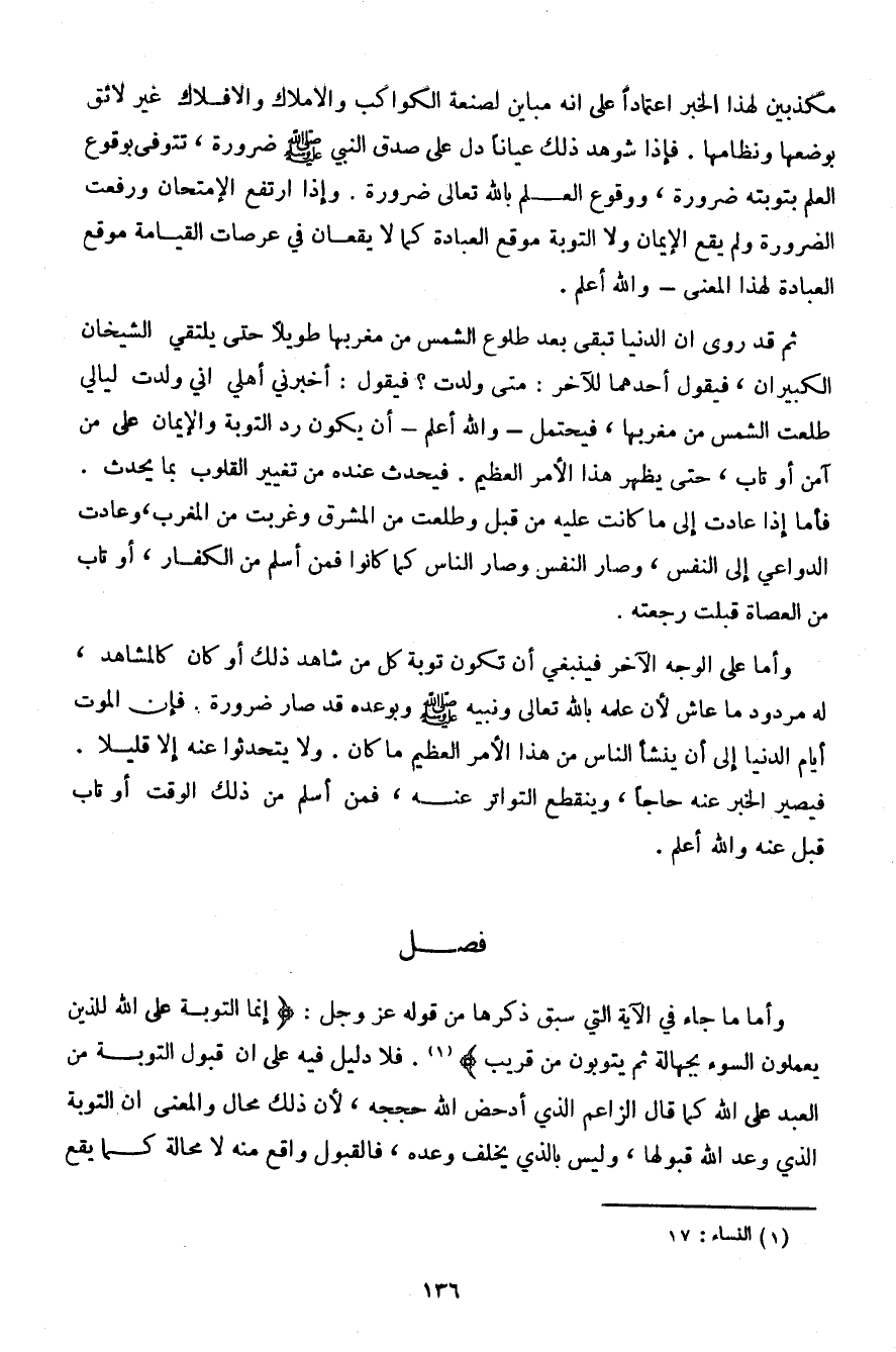 ثم قد روى أن الدنيا تبقى بعد طلوع الشمس من مغربها طويلًا حتى يلتقي الشيخان الكبيران، فيقول أحدهما للآخر: متى ولدت؟ فيقل: أخبرني أهلي أني ولدت ليالي طلعت الشمس من مغربها، فيحتمل- والله أعلم- أن يكون رد التوبة والإيمان على من آمن أو تاب، حتى يظهر هذا الأمر العظيم. فيحدث عنده من تغيير القلوب بما يحدث. فأما إذا عادت إلى ما كانت عليه من قبل وطلعت من المشرق وغربت من المغرب، وعادت الدواعي إلى النفس، وصار النفس وصار الناس كما كانوا فمن أسلم من الكفار، أو تاب من العصاة قلبت رجعته.