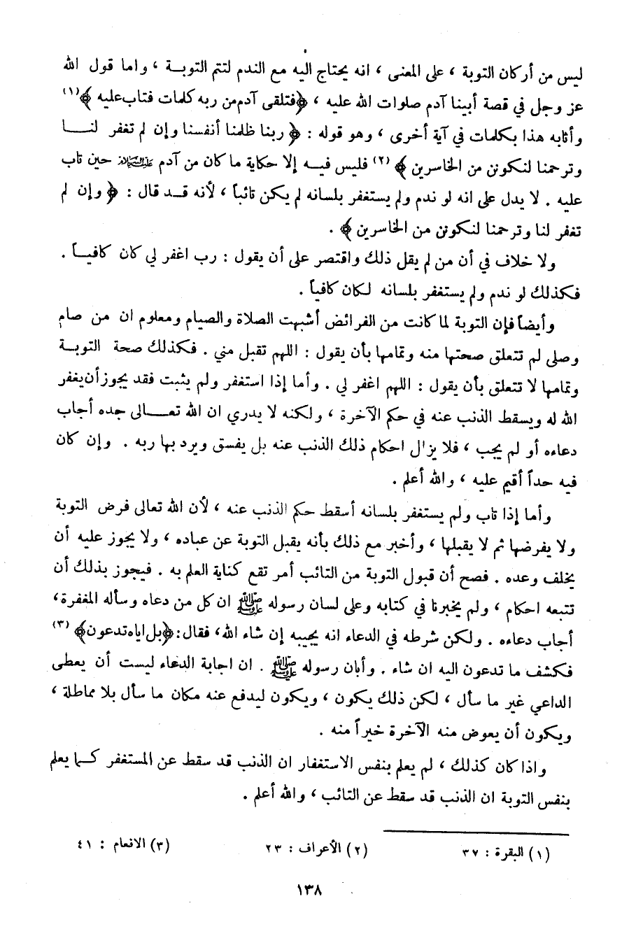 وأما إذا تاب ولم يستغفر بلسانه أسقط حكم الذنب عنه، لأن الله تعالى فرض التوبة ولا يفرضها ثم لايقبلها، وأخبر مع ذلك بأنه يقبل التوبة عن عباده، ولا يجوز عليه أن يخلف وعده. فصح أن قبول التوبة من التائب أمر تقع كناية العلم به. فيجوز بذلك أن تتبعه أحكام، ولم يخبرنا في كتابه وعلى لسان رسوله صلى الله عليه وسلم إن كل من دعاه وسأله المغفرة، أجاب دعاءه. ولكن شرطه في الدعاء أنه يجيبه إن شاء الله، فقال: {بل إياه تدعون} فكثف ما تدعون إليه إن شاء. وأبان رسوله صلى الله عليه وسلم. إن إجابة الدعاء ليست أن يعطي الداعي غير ما سأل، لكن ذلك يكون، ويكون ليدفع عنه مكان ما سأل بلا مماطلة، ويكون أن يعوض منه الآخرة خيرًا منه.